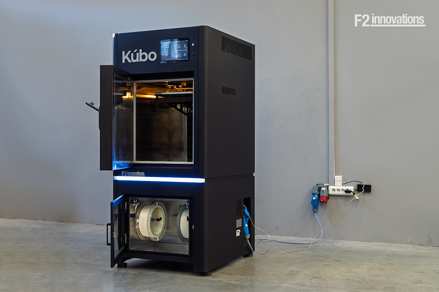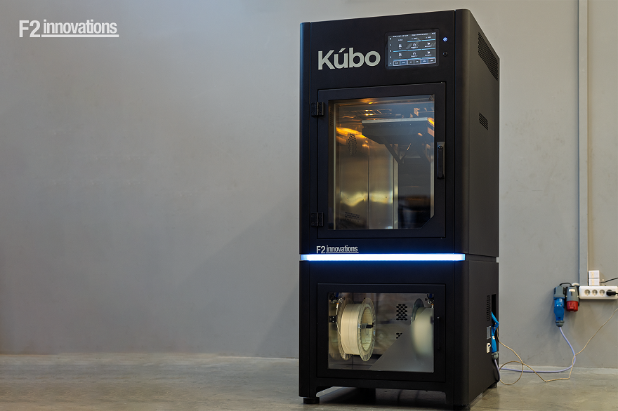 F2 Kubo — высокотемпературная аддитивная система, способная работать с широким ассортиментом полимерных и композиционных филаментов — от привычных пластиков до тугоплавких конструкционных термопластов, например полиэфирэфиркетона (PEEK) и полиэфиримида (PEI, Ultem), а также стекло- и угленаполненными композитами. 3D-принтер оснащен двумя экструдерами с максимальной температурой хотэндов 550°С. Дополнительно предусмотрен активный контроль фоновой температуры за счет конвекционной термокамеры и столика, разогреваемых до 200°С максимум. Калибровка осуществляется автоматически. Расходные материалы хранятся в отдельном сухом отсеке, подогреваемом до 60°С. Приводами системы позиционирования служат сервомоторы, вкупе с высокопроизводительными хотэндами обеспечивающие высокую скорость 3D-печати. Быстрозаменяемые хотэнды оснащаются износостойкими соплами из нержавеющей стали или сапфирового стекла.