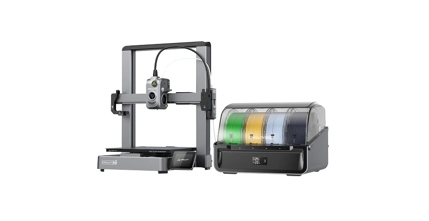 Creality Hi Combo — 3D-принтер Creality Hi в комплекте с системой автоматической смены филамента Creality Filament System (CFS), принимающей до четырех катушек. При желании можно подключить до трех дополнительных модулей и расширить количество одновременно доступных филаментов до шестнадцати. 3D-принтер использует прошивку Creality OS на основе Klipper с алгоритмами активного гашения вибраций и динамического контроля подачи расплава, позволяющими развивать скорости позиционирования до 500 мм/с с ускорениями до 12 м/с^2. Хотэнд с максимальной температурой 300°С, столик с прогревом до 100°C и износостойкие стальные шестерни фидера и сопла позволяют печатать наиболее распространенными полимерами, включая некоторые абразивные композиты, например стекло- и угленаполненные. Система автоматической смены филамента может использоваться для печати многоцветных изделий, а также поддерживает режимы 3D-печати с использованием специализированных опорных материалов и резервирования — автоматического переключения с полностью использованной катушки на запасную.