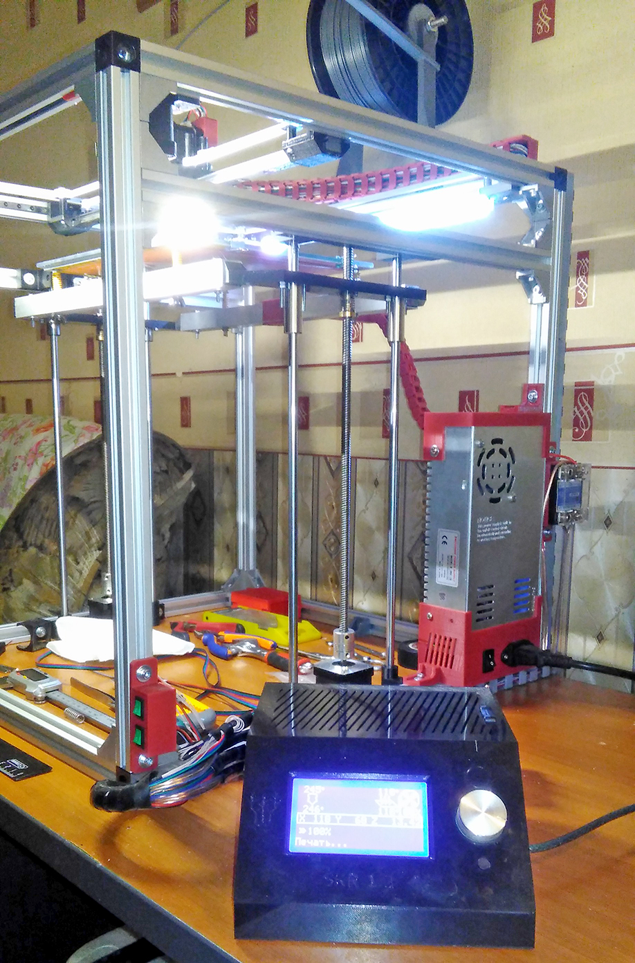 Кинематика Core XY, размер области печати 235х235х290, экструдер Direct, плата управления SKR 1.3, драйвера двигателей TMC2209 UART. Самосбор. За идею взята конструкция HyperCube, но все детали и крепления смоделированы и распечатаны самостоятельно.
