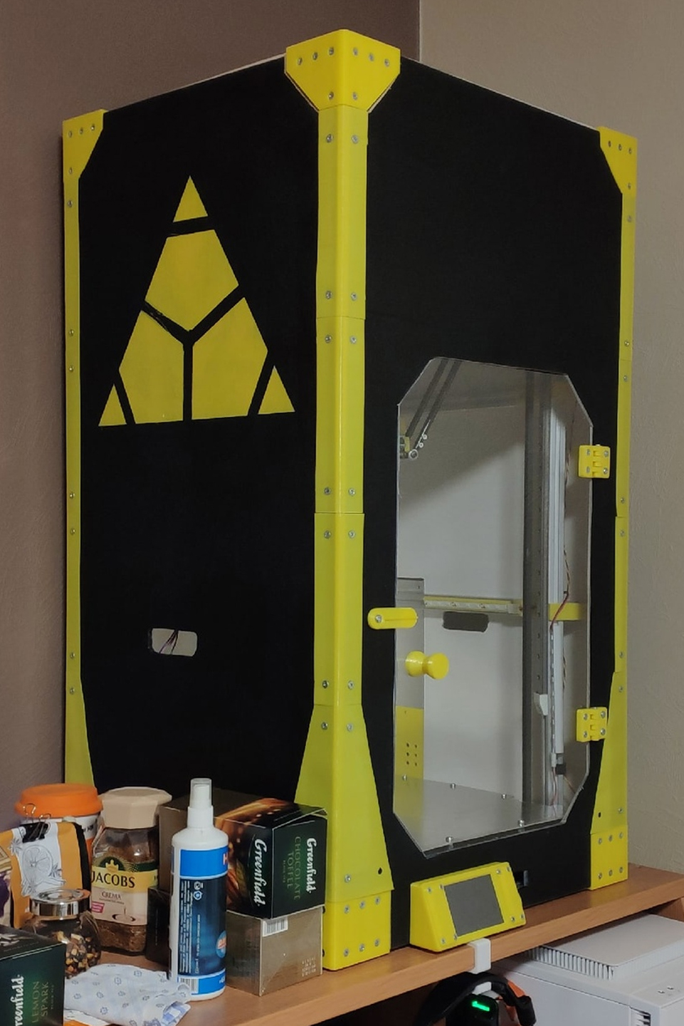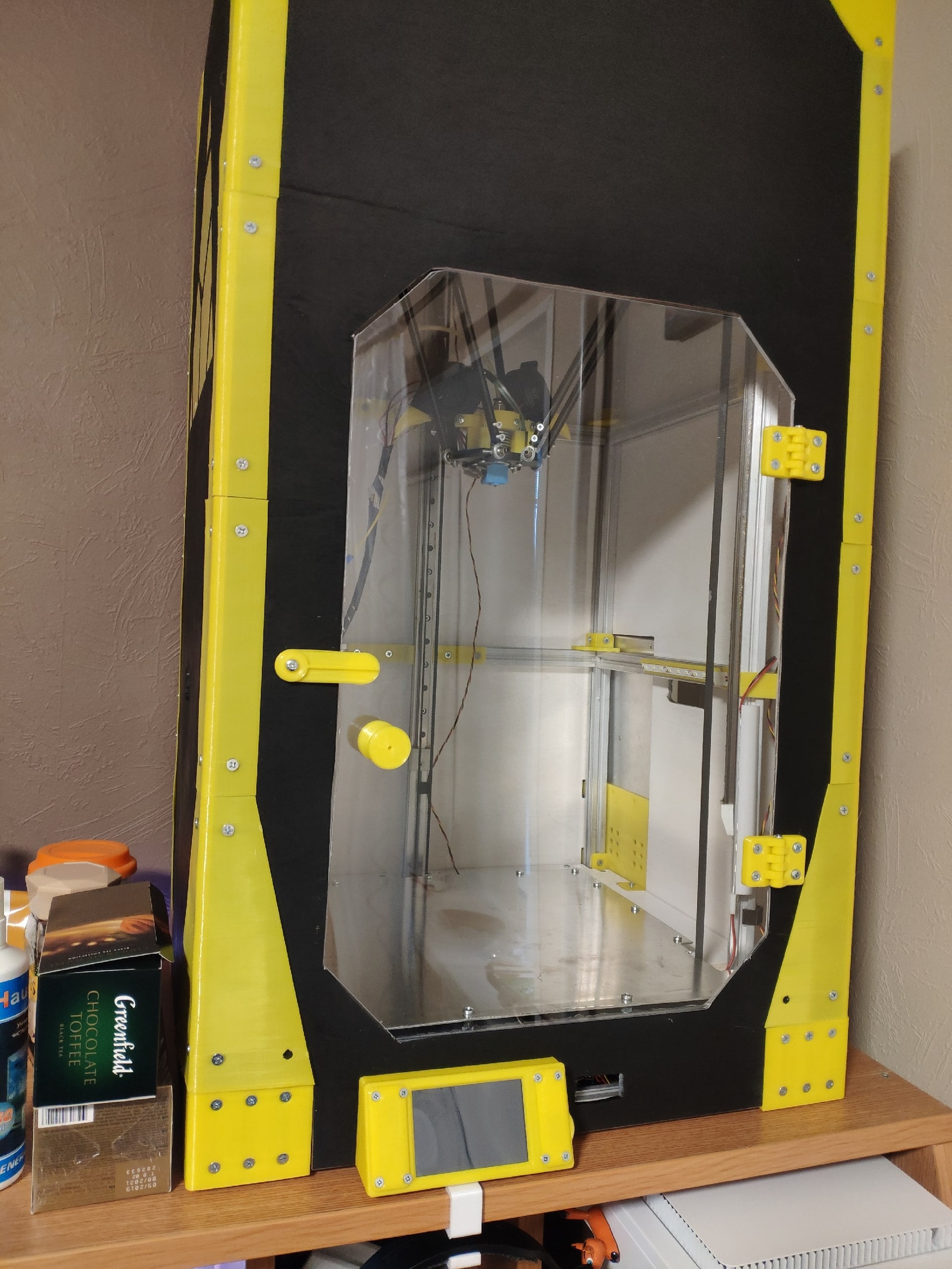 Полностью самостоятельно сконструированный 3D принтер с кинематикой Delta, в закрытом корпусе. Построен на конструкционном профиле 2020, использует в качестве направляющих рельсы MGN12 с удлиненными каретками. Управляющая плата - 32 битная Lerdge X.