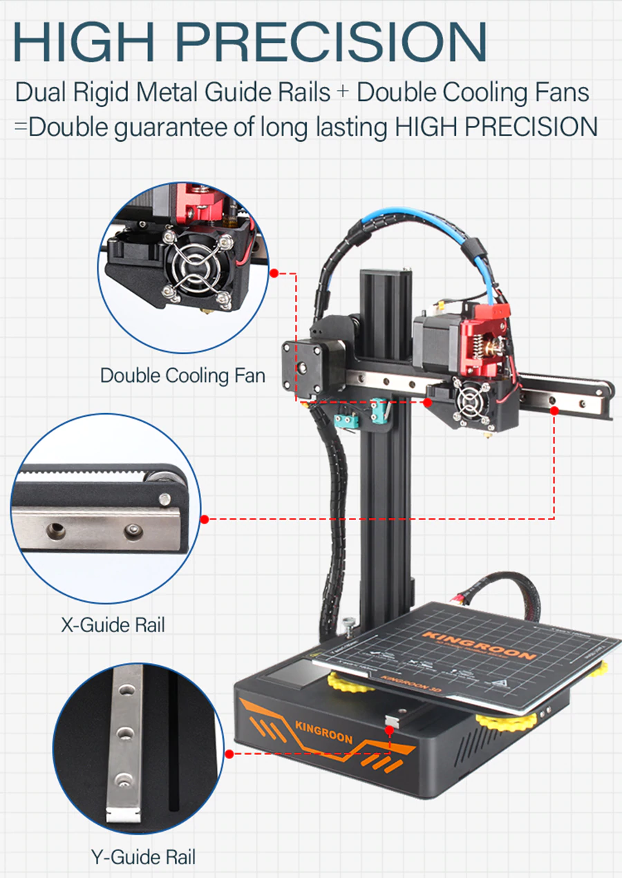 Бюджетный 3D принтер для новичков и домашнего использования. Kingroon KP3S подойдет для бытовой печати, изготовления детских игрушек, пластиковых элeментов. В отличие от большинства устройств, эта модель может работать с любыми операционными системами, имеет несколько языковых локализаций (в том числе и русскую). Распечатать на этом 3D принтере можно объекты из файлов: obj, afm, stl. Габариты и вес Kingroon kp3s позволяют эксплуатировать его в любом помещении и легко транспортировать, например, из дома в офис.