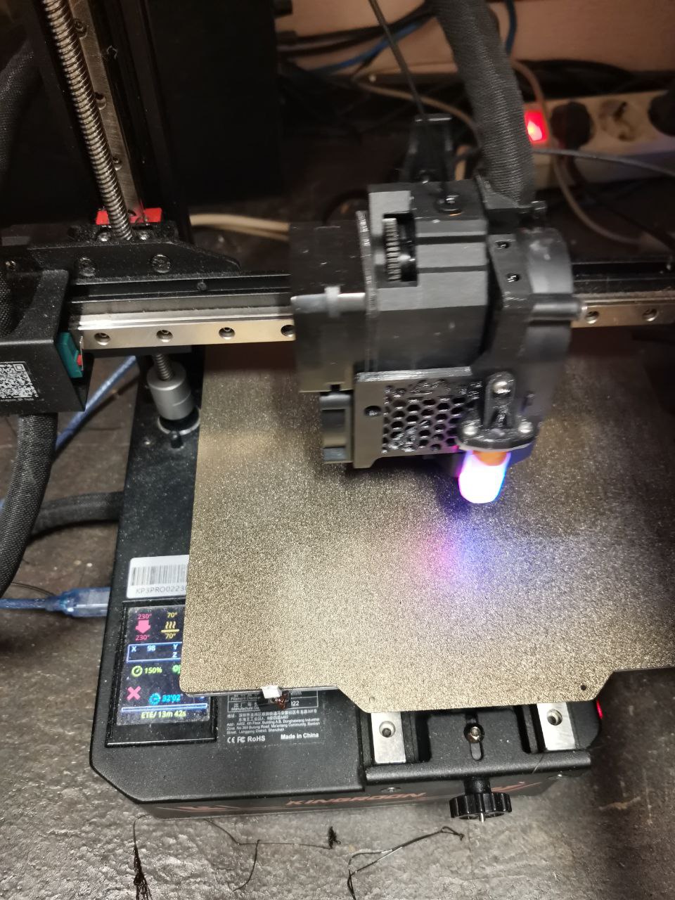 KP3S Pro S1, заменен экструдер на DUAL DRIVE EXTRUDER с вообще другой 3Д моделью экструдера, установлен Tounch, стол - металлический PEI лист на магните, понижено напряжение на вентиляторах, установлена чистилка соплей, оси все выровнены по поверочному угольнику, замены пружины на столе и убран стоп для стола вообще, замена втулка соединения винта оси Z и двигателя, верхняя фиксация убрана вообще, установлен керамический нагревательный элемент, all metal bi-metal, прошивка - последний Marlin, каоибровка INPUT SHAPING, SKEW, и т.д. и. т.п. Все калибровки из ORCASLICER. Печатает на скороости 150 вполне норм. Не хуже Bambulab A1 mini :)