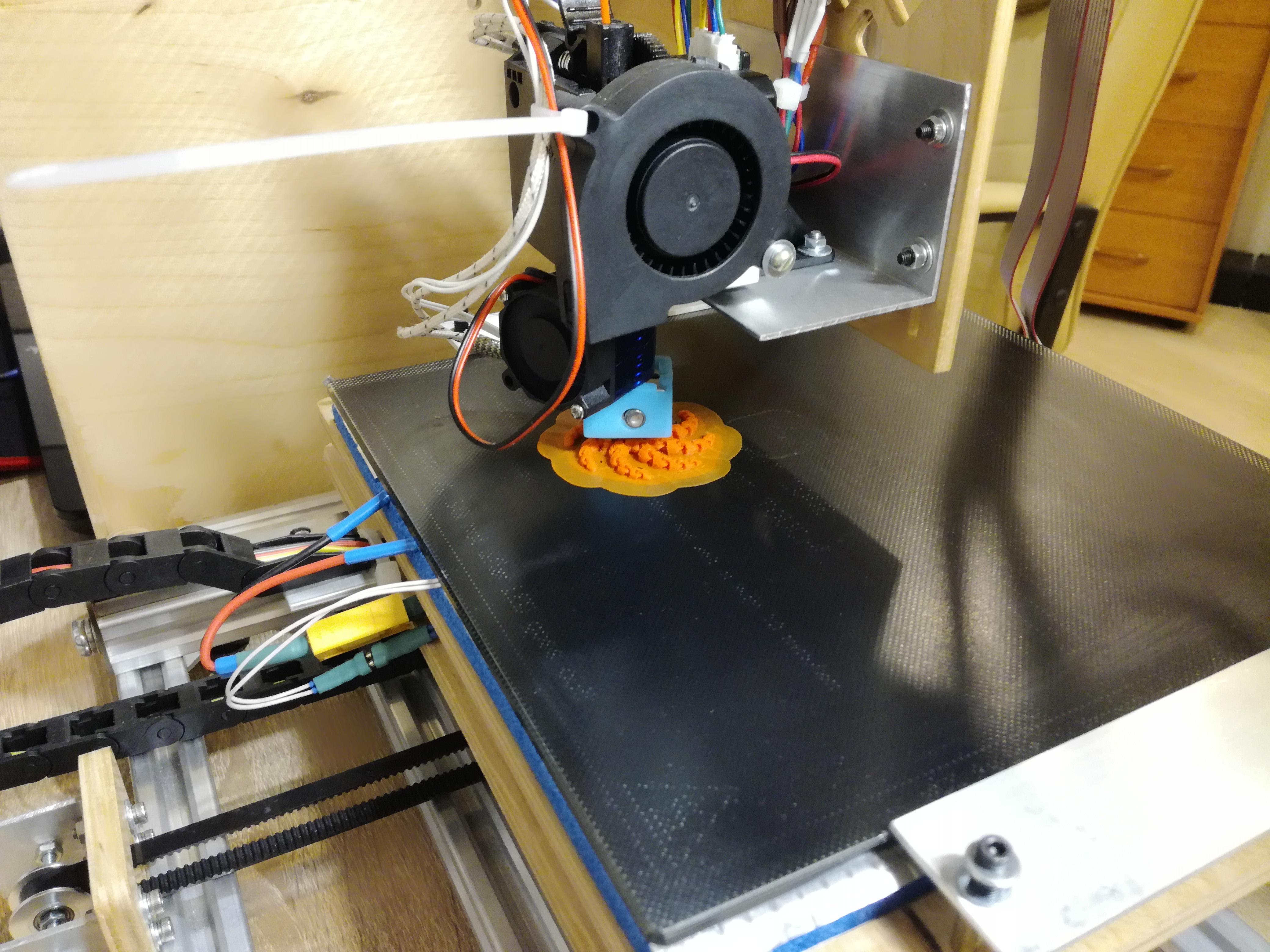 Принтер с кинематикой, классической для ЧПУ фрезеров на 3 оси (подвижный стол, каретка Z двигается по балке портала X), но на ремнях.