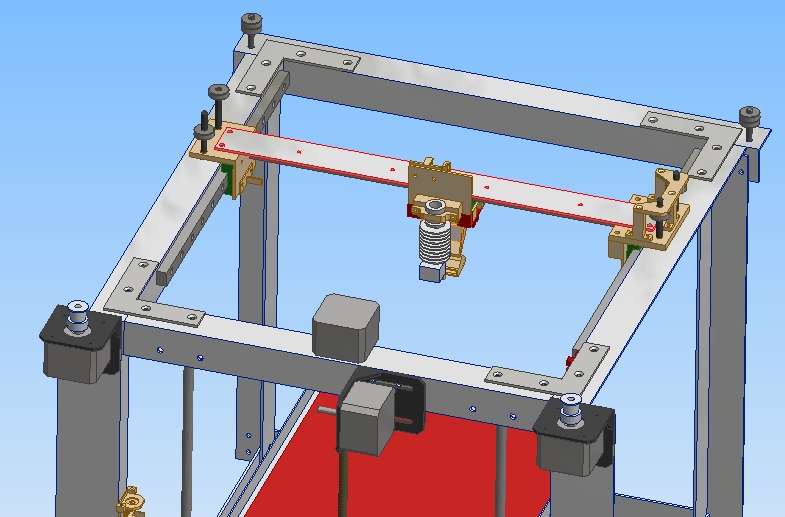H-Bot на рельсах. Рама из алюминиевых уголков. БП от компьютера на 350Вт. Электроника Arduino Mega + RAMPS 1.4. Оптические датчики концевики. Боуден, китайский хотенд E3D v5