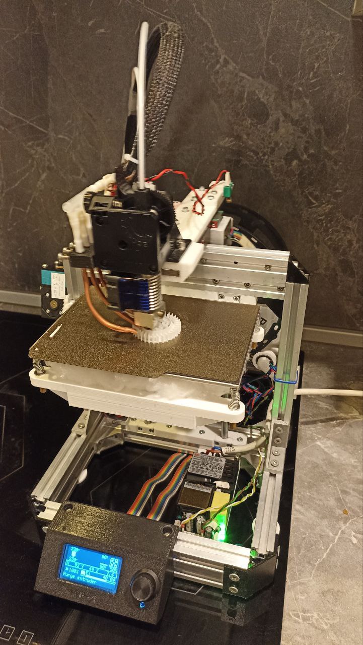 Компактный переносной принтер с небольшой областью печати (X*Y*Z) 160*100*100 мм. Кинематика почти стандартная - оси X и Y - экструдер, Z - стол. Катушка с пластиком ставится на борт принтера, позволяя переносить его одной рукой с одного места на другое (беру иногда с собой на работу или на дачу). Плата управления - SKR 3 (хотя можно было обойтись и SKR Mini). Экструдер стандартный E3D. Из не совсем стандартного - обдув детали выполнен через несколько медных трубок, подведенных в область сопла, а качает воздух мембранный насос. Привод стола - NEMA17 с трапецеидальными винтом и гайкой. Привода головки - NEMA 11 на парах шестерня-рейка с модулем зуба m0,5. Кронштейн стола, каретки стола, стопоры а также шестерни и рейки осей X и Y распечатаны на рабочих принтерах Qidi Q1 и Kingroon KP3S. Блок питания - компактный бескорпусной 300Вт 24В от MeanWell. Дисплей - MKS12864 v3.