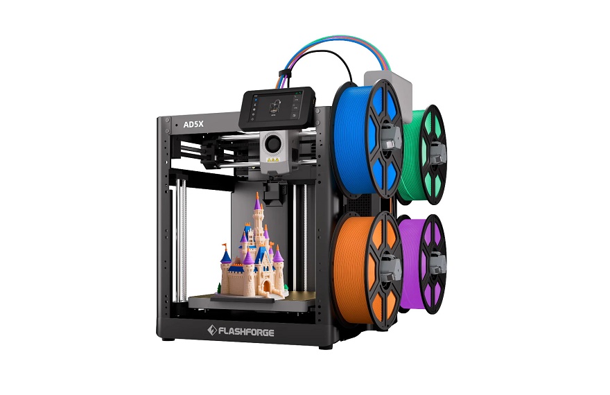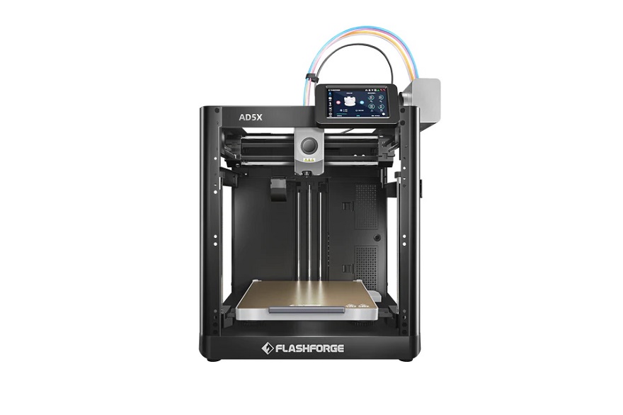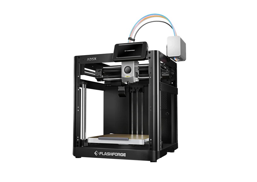 Flashforge AD5X — настольный FDM 3D-принтер бюджетного класса с максимально упрощенной системой автоматической смены филаментов, принимающей до четырех катушек. Катушки навешиваются прямо на боковую панель, филаменты подаются по отдельным боуденовским трубкам в головку, где попеременно поступают в хотэнд. Скорости позиционирования и ускорения головки достигают 600 мм/с и 20 м/c^2 соответственно благодаря прошивке с алгоритмами активного гашения вибраций и динамического контроля подачи расплава. Хотэнд прогревается до 280°С, позволяя работать с обычным пластиками вроде полилактида (ПЛА) или полиэтилентерефталатгликоля (ПЭТГ). Бортовой интерфейс представлен 4,3-дюймовым цветным сенсорный экраном, портами USB и Ethernet, а также модулем беспроводной связи (Wi-Fi).