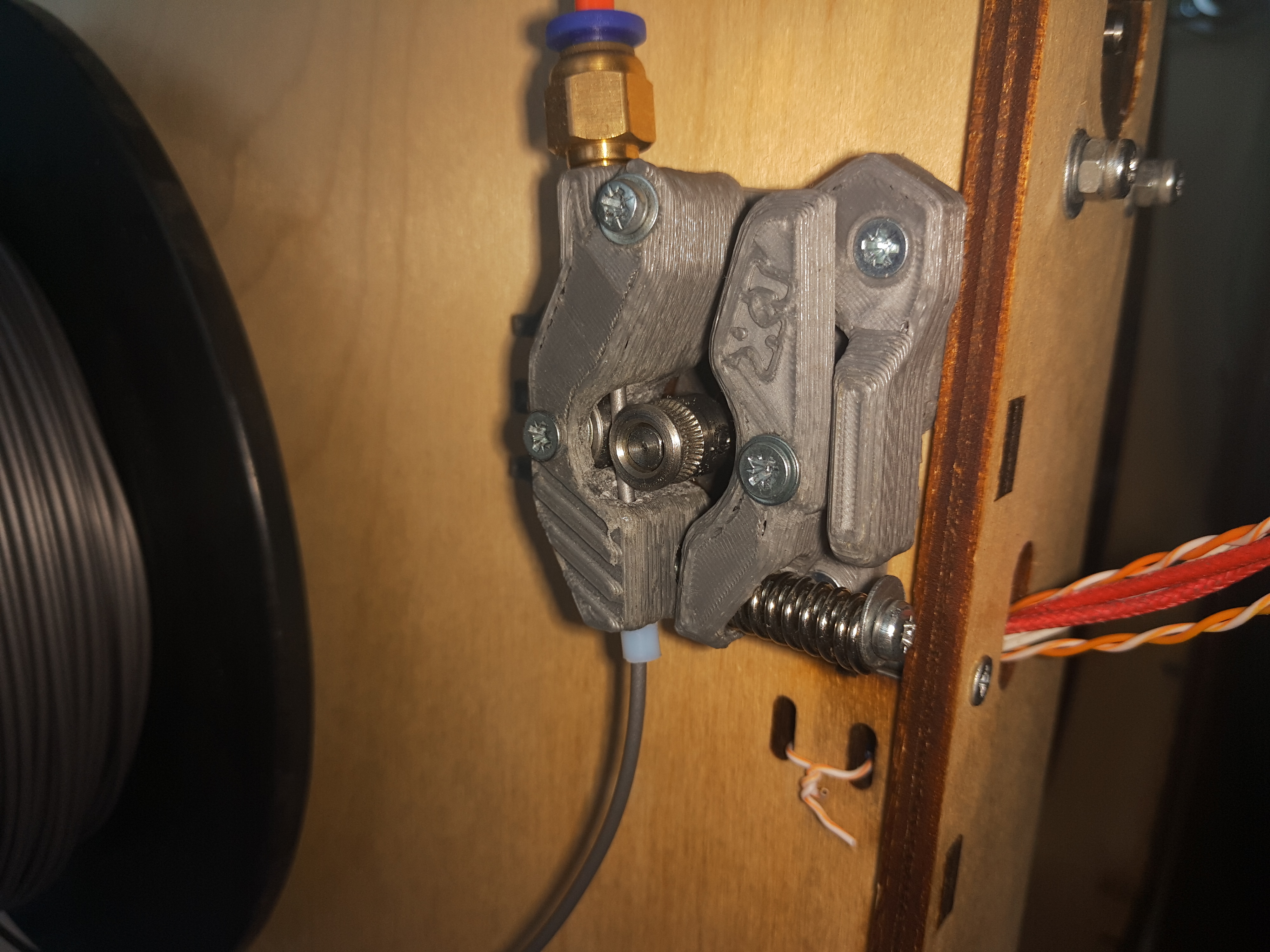 6. Фидер изначально стаял китайский алюминиевый, но ввиду несовершенства конструкции (пруток изгибало при подаче, низкий момент на подающей шестерне Ø11 мм) был заменен на напечатанный родной с шестерней Ø7.4. Печатался он на только что собранном и не настроенном принтере. Качество очень пострадало, к тому же еще и в зеркальном исполнении (плиз, не бейте). В добавок к вышесказанному уже позже, при попытках избавится от недоэкструзии, выяснилось, что каретка с подшипником трется о подающую шестерню что значительно уменьшало момент плюс доп нагрузка на шаговик. Доработал каретку гравером и залил все это безобразие суперклеем.