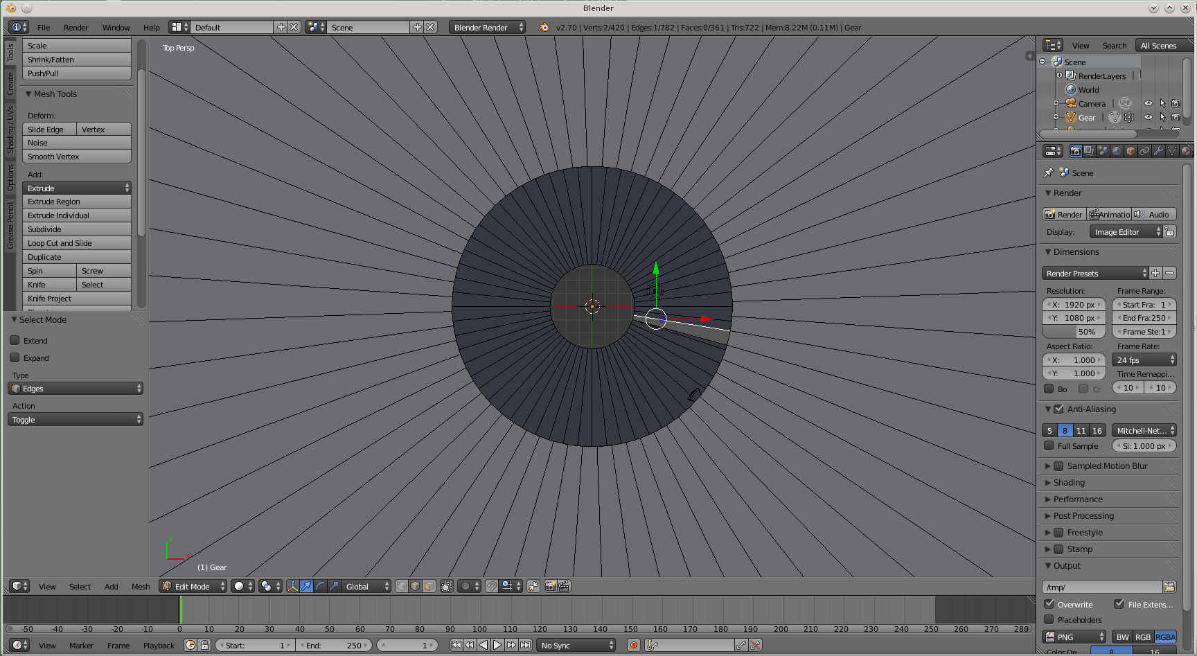 Переключаемся в режим редактирования ребер (сочетание Ctrl+Tab и выбираем Edge или просто нажимаем на соответствующую кнопку на панели свойств 3d окна).Выбираем ПКМ одно из свободных ребер на созданной грани.Нажимаем F пока грани полностью не закроют отверстие под ось.Шестерня практически готова. Замечу, что при создании конических шестеренок алгоритм создания отверстия под ось будет немного другой. Если вкратце, то заливаем верхнее и нижнее отверстия, вставляем вдоль оси цилиндр, необходимого диаметра и вычитанием цилиндра из шестерни формируем отверстие. Если интересно, напишу следующим постом.