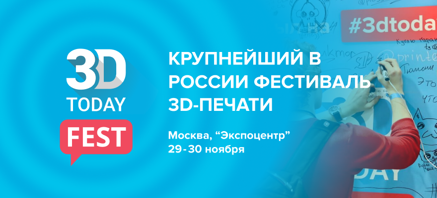 Уже надоела унылая осенняя погода? Нужна теплая атмосфера и интересное времяпровождение? Тогда приглашаем на главный праздник 3D-технологий в России — фестиваль 3D-печати 3Dtoday Fest. Фестиваль соберет практически всех отечественных производителей персональных и профессиональных 3D-принтеров и расходных материалов, множество студий и мастеров и станет крупнейшим отраслевым мероприятием года.