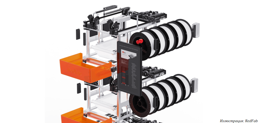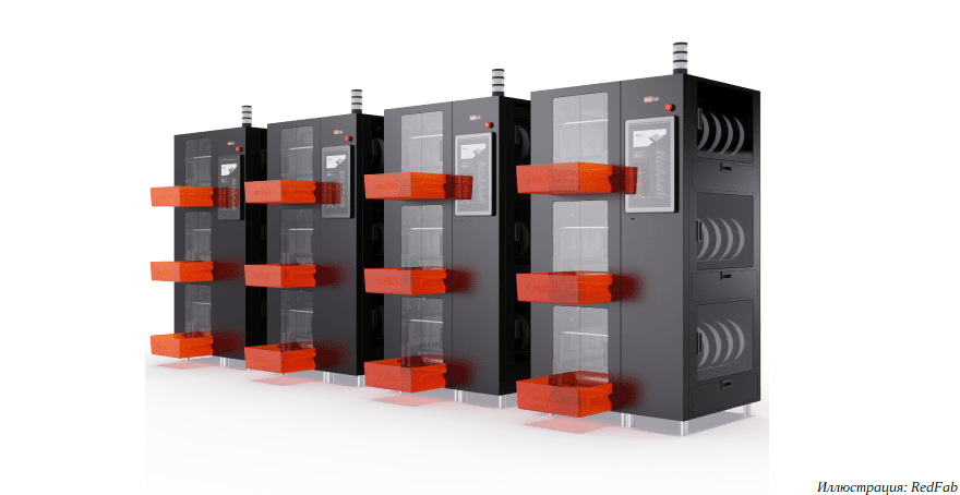 Результатом стараний коллектива стал промышленный 3D-принтер RedFab. Эти устройства можно собирать в модульные кластеры, а затем подключать к единой сети. От оператора требуется лишь отправить задание на 3D-печать, все остальное система управления сделает сама. Детали печатаются на подвижной ленте, прижимаемой к платформе вакуумом. По окончании 3D-печати лента протягивается через систему охлаждения, деталь отлипает и падает в контейнер.