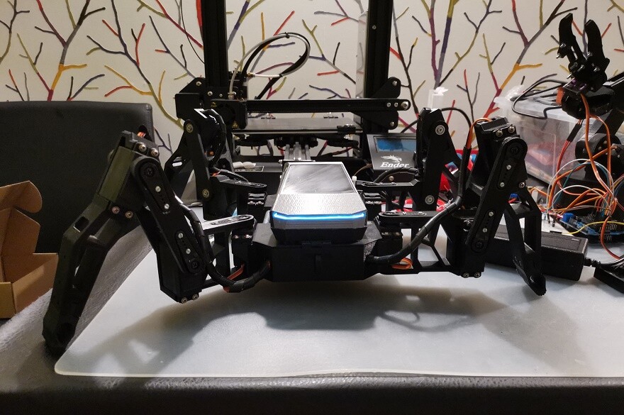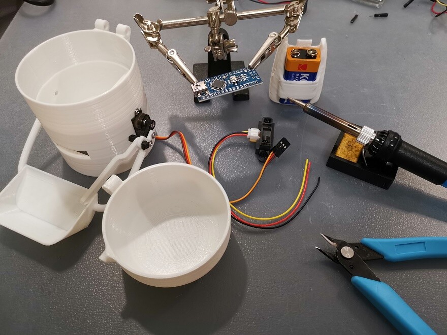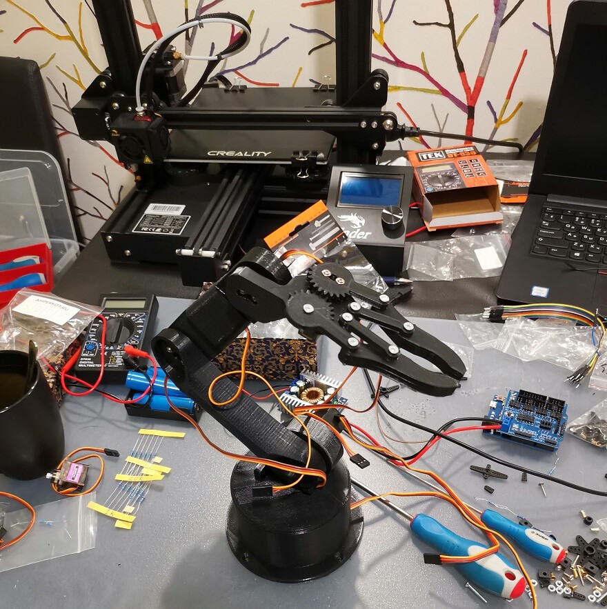 Мастерская развернута дома: здесь есть паяльник SH72, удобный комплект «третьей руки» с множеством зажимов, удобный при работе с малогабаритными деталями. На этапе прототипирования и первичной сборки электронных самоделок выручает регулируемый блок питания WANPTEK DPS3010U, выдающий до десяти ампер, чего достаточно для запуска множества сервоприводов. Время от времени приходилось обращаться к знакомым за лазерной резкой, особенно на первых порах, но сейчас по большей части используется 3D-принтер. Из измерительного оборудования есть штангенциркуль Micron. Что касается 3D-принтеров, то тут опробованы два варианта — сначала Creality Ender-3, а затем Flyingbear Ghost 5.