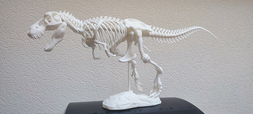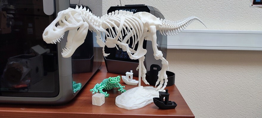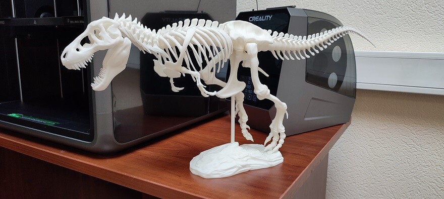 Напоследок, эксперимент по 3D-печати большого художественного изделия для оценки работы с мелкими и тонкими деталями на примере скелета динозавра, состоящего из множества составных частей. 3D-печать велась белым PLA от eSUN по причине неприхотливости материала, хорошей эстетики и низкой усадки. Последний момент важен, так как это сборная конструкция со стыковкой элементов без использования клея.
