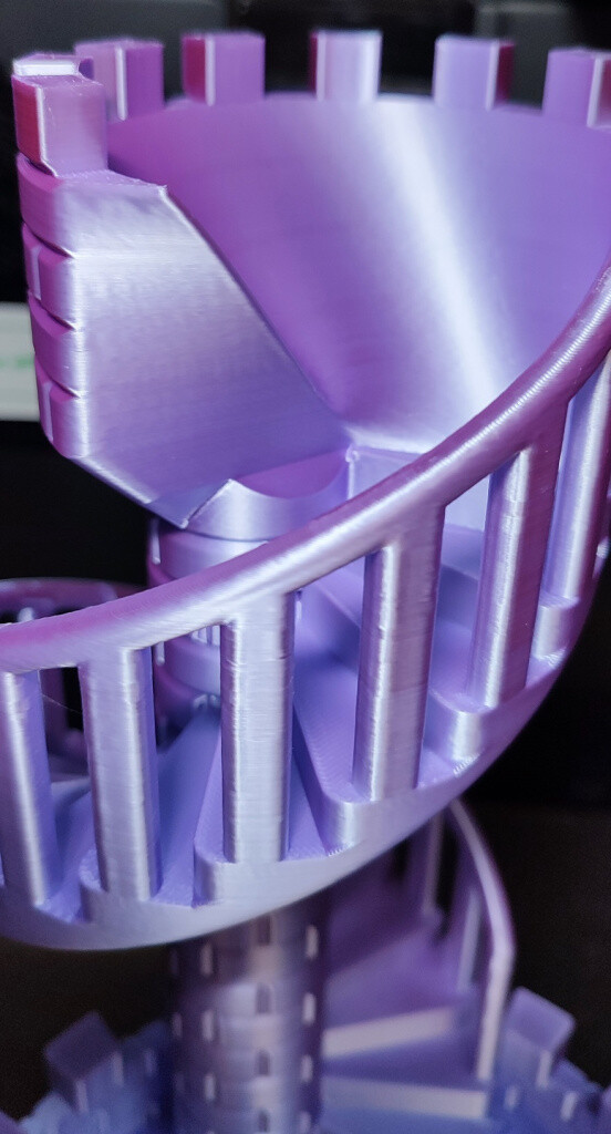 Следующий тест — долгая 3D-печать художественной модели из «шелкового» филамента PLA Silk во всю высоту рабочего объема. 3D-печать длилась девять часов при толщине слоев 0,2 мм. Хотя печатью из PLA уже никого не удивить, нам в первую очередь хотелось оценить качество на высоких скоростях, в том числе наличие артефактов на верхней части модели, зачастую появляющихся из-за вибраций столика при недостаточной жесткости. Результаты ниже показывают, что этот недостаток отсутствует, да и обдува модели без открытия дверцы оказалось вполне достаточно.