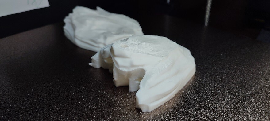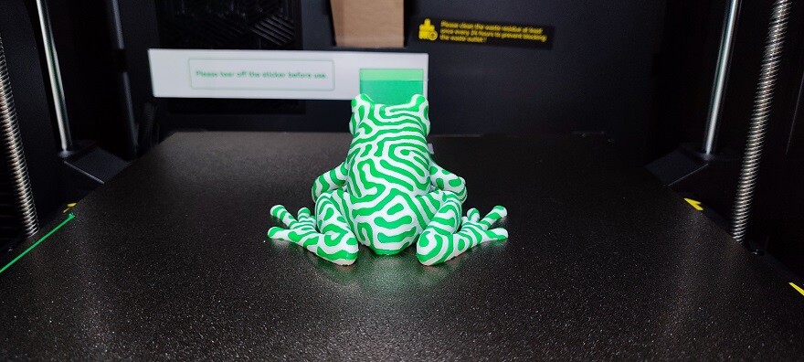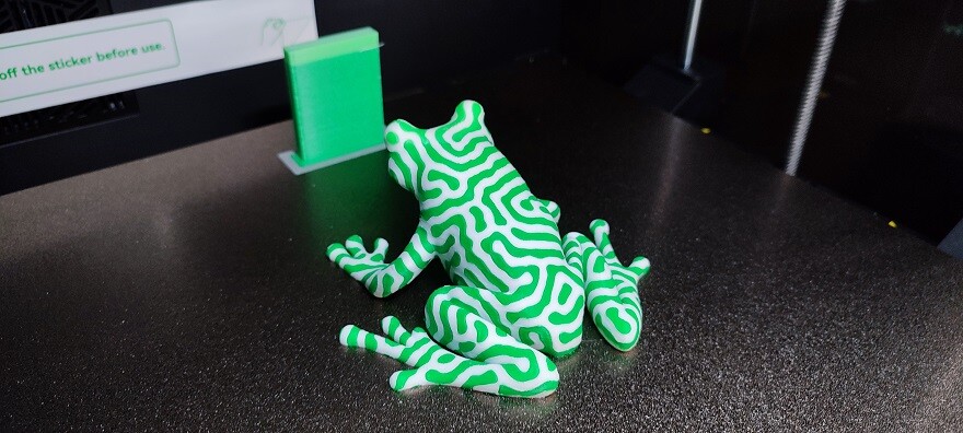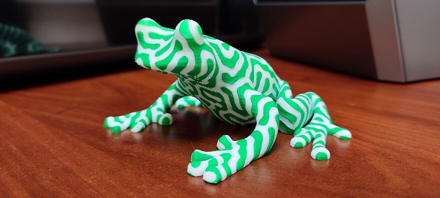 Для оценки многоцветной 3D-печати с применением CFS использовался PLA зеленого и белого цвета. В настройках выставлена черновая башня для исключения смешивания материалов. 3D-печать велась без поддержек, слоями 0,2 мм. Модель выращена за тринадцать часов с неизбежно высоким объемом отходов, обусловленным частой сменой материала. В целом, нареканий почти нет, за исключением артефактов на нависающих участках в нижней части головы по причине отсутствия поддержек. Артефакты незначительные, что говорит о грамотном проектировании системы обдува.