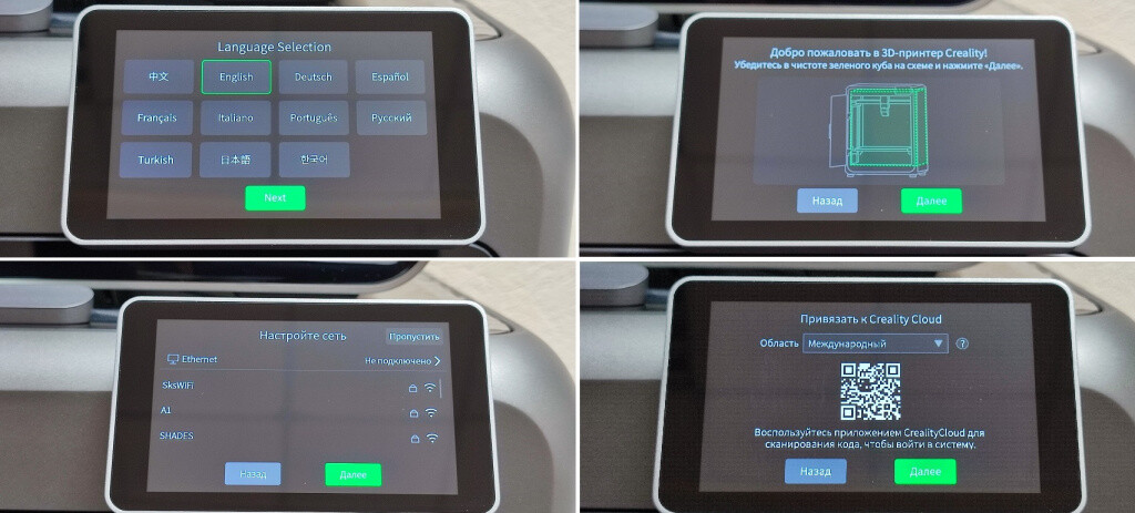 После сборки включаем питание, выбираем язык системы, подключаем к сети Wi-Fi или Ethernet, выбираем часовой пояс, проходим процедуры автоматической проверки 3D-принтера и обновляем прошивку, если система обнаружит новую версию.