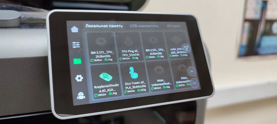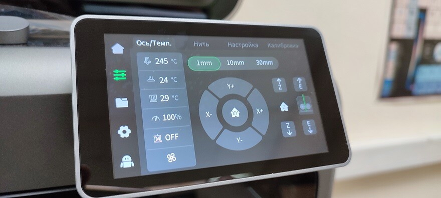 Меню 3D-принтера содержит весь необходимый инструментарий и информацию по работе с принтером — настройки филаментов, движение по осям, различные виды калибровок, внутреннее файловое хранилище, настройки сети и доступ к справочной информации. При работе с принтером в сети весь функционал доступен в программном обеспечении, и необходимость работы с бортовым дисплеем практически отпадает.