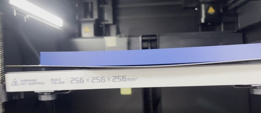 Столики большинства современных 3D-принтеров накрываются пластинами с адгезионными покрытиями из полиэфиримида (PEI) и магнитными креплениями. Такие пластины дают великолепную адгезию, легко снимаются и за счет гибкости позволяют быстро отделять готовые модели без серьезных усилий. Есть и недостаток: при 3D-печати больших моделей из материалов с высокой усадкой возможно не только произвольное отделение изделий от пластин, но и сгибание самих пластин под воздействием усаживающегося полимера, как на иллюстрации ниже.