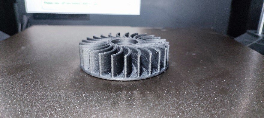 С угленаполненным композитом на основе ABS принтер справился без особых происшествий. Несмотря на то, что материал при сгибании достаточно ломкий, проблем с системой CFS и перегибами нити в тефлоновых трубках не возникло. Поверхность модели получилась ровной, без наплывов и смещения слоев. Дополнительные средства повышения адгезии не использовались, хватило пластины с полиэфиримидным покрытием.
