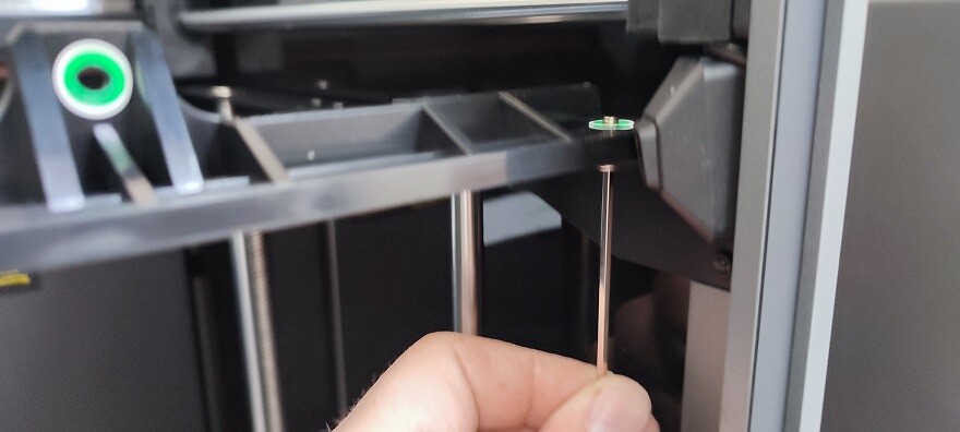 После откручивания винтов, удерживающих CFS на верхней и нижней планке, необходимо аккуратно вытащить систему через верхнюю часть принтера, снять четыре защитных фиксатора с направляющих стола, отсоединить от корпуса все крепежные планки (верхняя планка откручивается снизу) и освободить рабочий стол, открутив фиксирующие винты справа и слева, ориентируясь по стрелкам. На фотографии ниже справа над столом виден нагревательный элемент рабочего объема.
