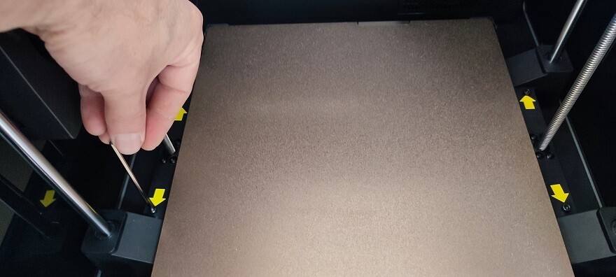 Массивный столик площадью 300х300 мм накрыт пластиной с полиэфиримидным адгезионным покрытием (PEI) и магнитными креплениями. Столик перемещается по четырем мощным цилиндрическим направляющим с помощью двух винтовых приводов и оснащен вспомогательными винтами для ручной юстировки, если возникнет такая необходимость.