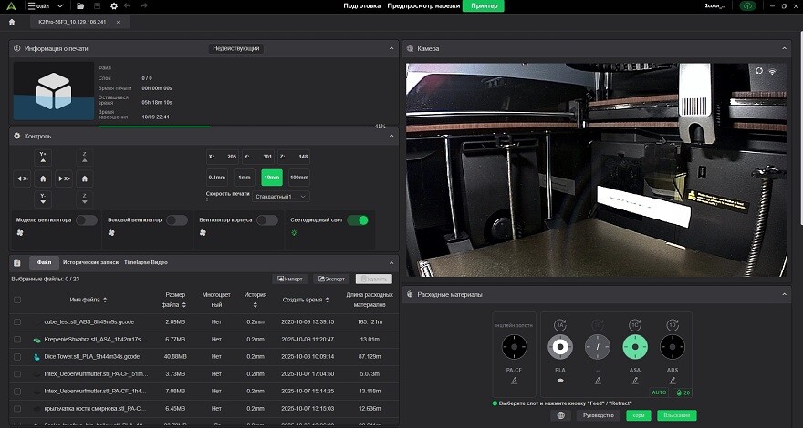 В Creality Print отображается текущее состояние 3D-принтера наряду с загруженными в CFS филаментами и материалом на внешней катушке. Передачу файлов и запуск 3D-печати можно осуществлять посредством сетевого соединения, без необходимости в использовании внешнего накопителя.