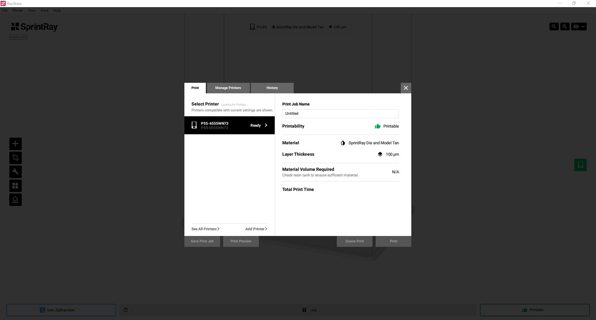 Выбираем файл модели в меню Print и можем оценить длительность печати – 1.17 минут. Вполне неплохо, учитывая объем модели. Кстати, загруженный материал вы устанавливаете самостоятельно при настройке устройства и подборе параметров в слайсере. SprintRay работает с прямой загрузкой полимера в кювету, без хитрых картриджных систем. Тем не менее, профили для всех поддерживаемых материалов вшиты в прошивку и слайсер по умолчанию.