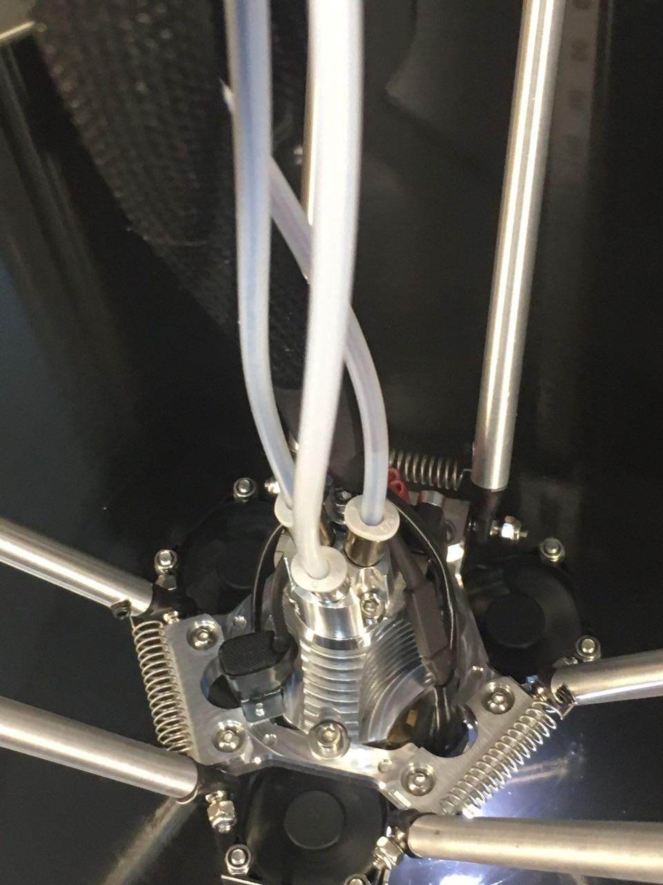 У 3D принтера MassPortal Pharaon XD40 такого впечатления, нет. Все строго и надежно.Перейдем к экструдеру. Это Боуден, но достаточно оригинальный. С помощью этого экструдера можно печатать тремя(!) материалами.Внешний вид весьма впечатляет.