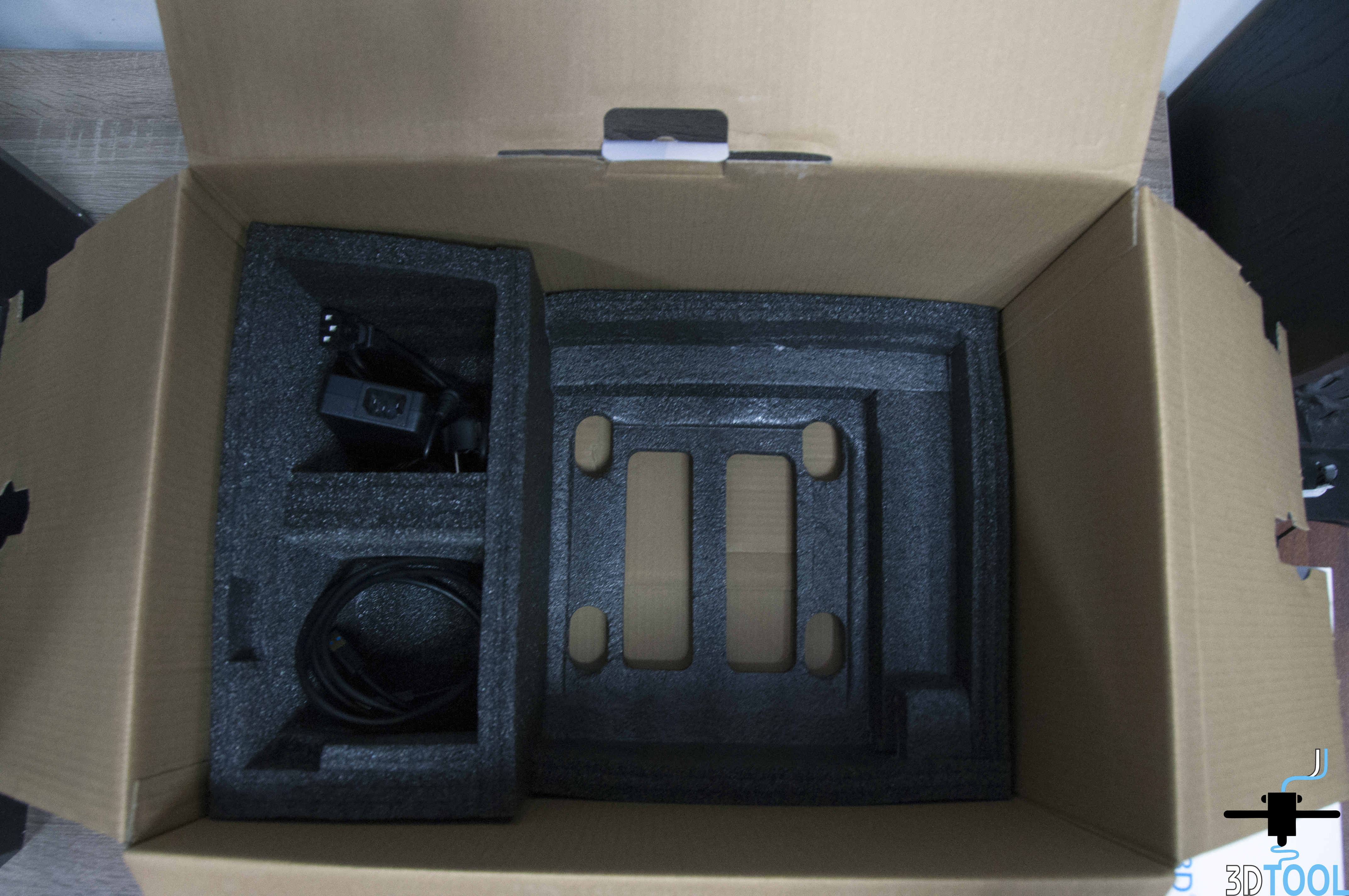 Сканер приходит в такой коробке, она довольно толстая и прочная, что позволяет не повредить сканер во время перевозки. Внутри коробки находится еще одна коробка, но уже с фирменным стилем от Shining 3D.Открываем ее и видим упаковку из пенополистирола черного цвета, сверху укомплектовано: