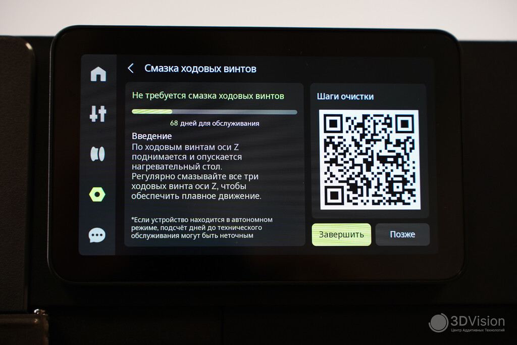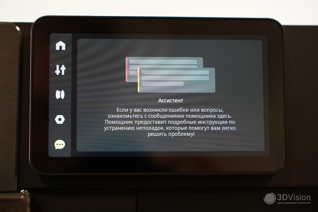 Ассистент помогает в устранении неполадок при работе. К примеру, если во время печати открыть дверцу, увидим уведомление с просьбой её закрыть. В случае более серъёзных сбоев печать останавливается, и ассистент отображает QR‑код, содержащий инструкцию по решению проблемы.