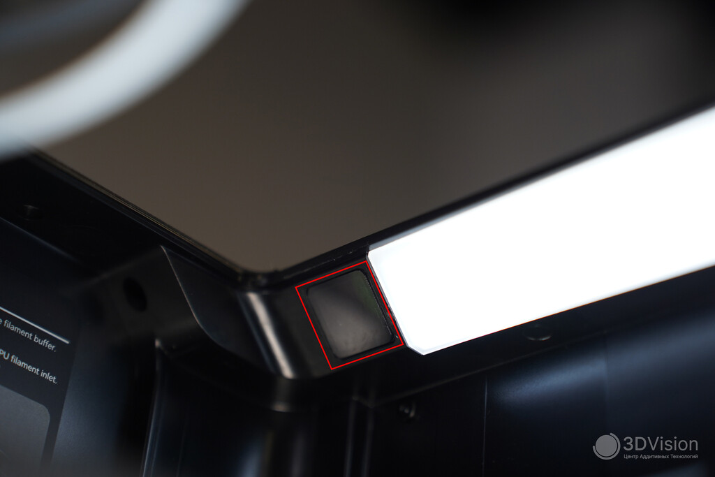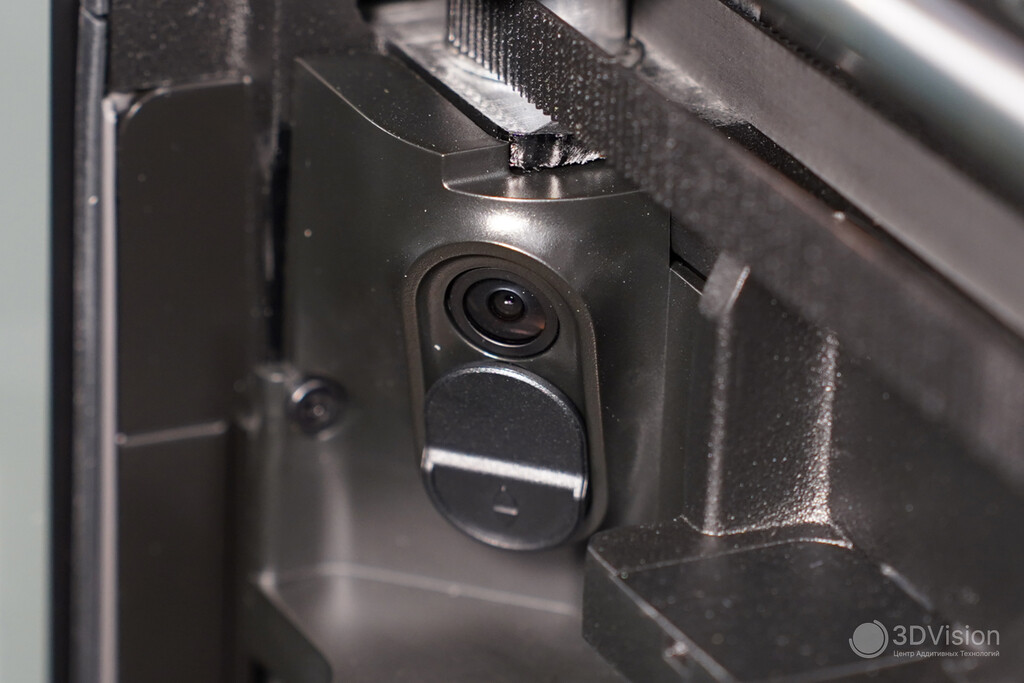 Теперь поговорим о камерах. Одна направлена на сопло, другая — на стол, третья служит для мониторинга процесса и создания таймлапсов. Каждая из них отвечает за свою зону, а в совокупности они непрерывно отслеживают процесс печати и выявляют наиболее распространённые дефекты: «лапшу», печать в воздухе, налипание пластика на сопло. При обнаружении вышесказанного печать приостанавливается. Чувствительность работы этих функций можно настраивать, также их можно полностью отключить.