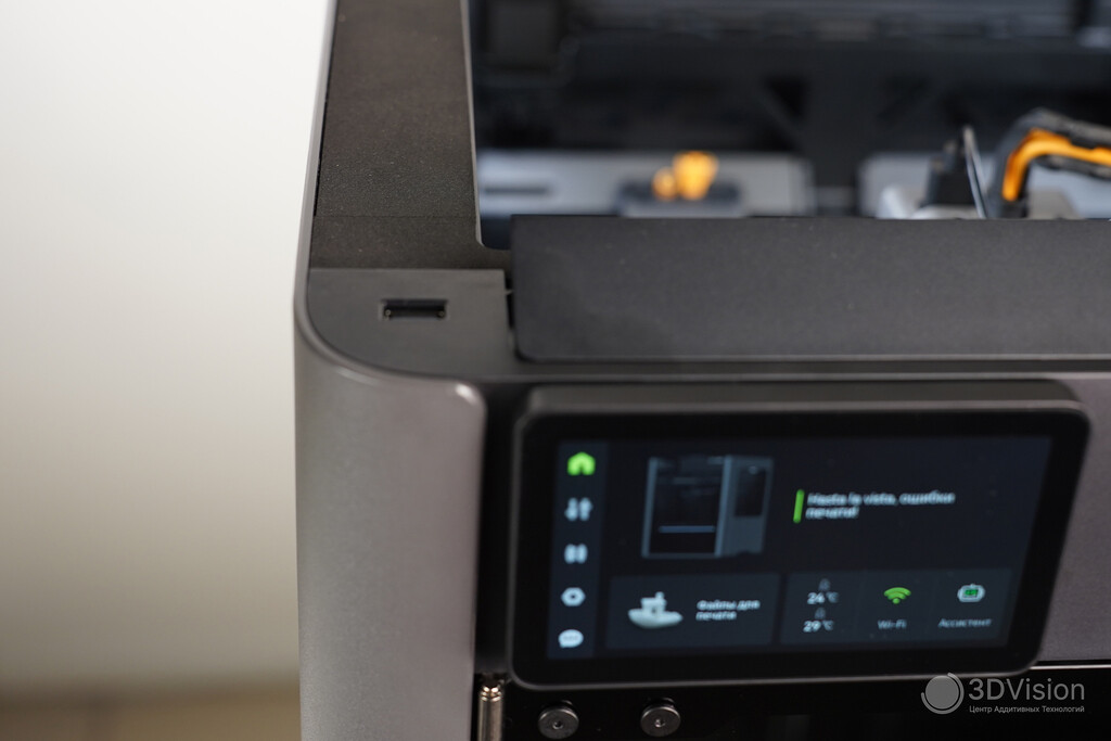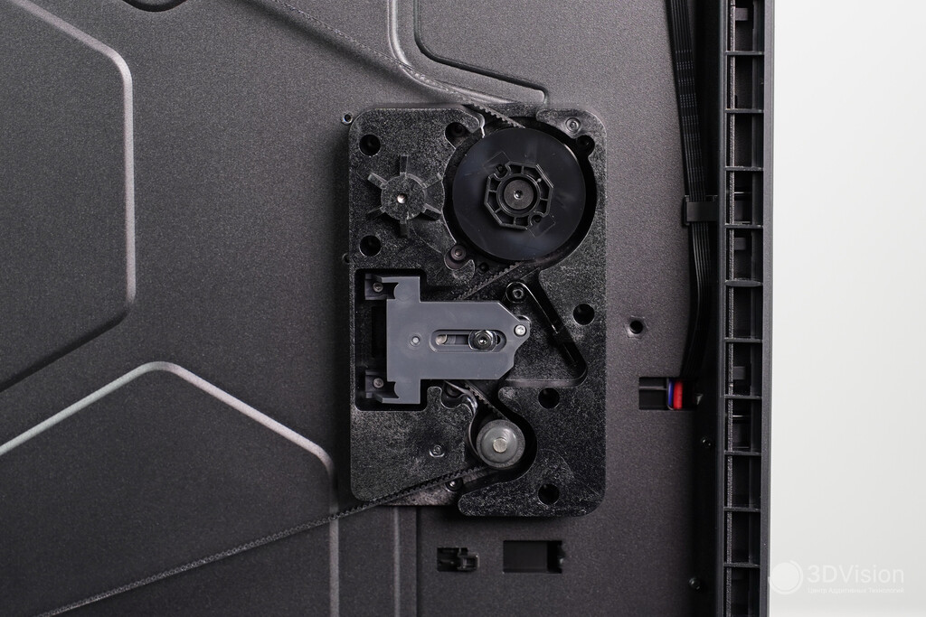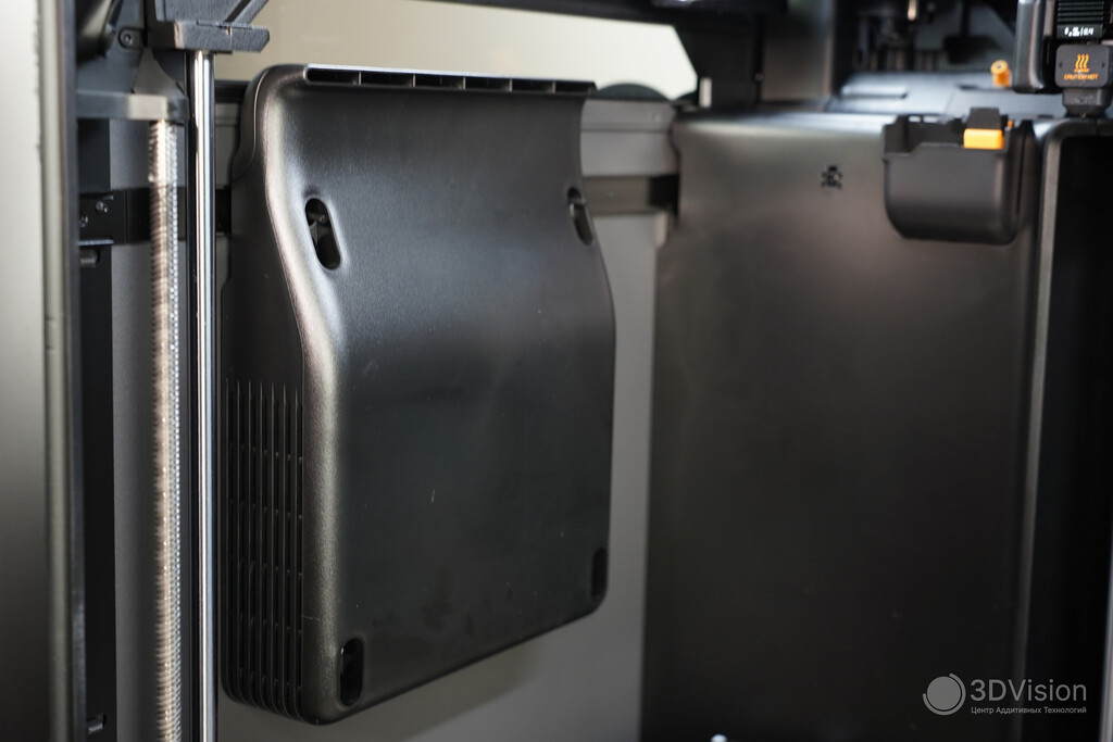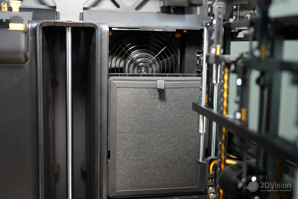 При печати из PLA внутреннее пространство термокамеры охлаждается вытяжным вентилятором — это тоже создаёт ощутимый шум, но он тише, чем при открытой крышке или двери. Шторки вентилятора в задней части принтера также нивелируют шумоизолирующий эффект.