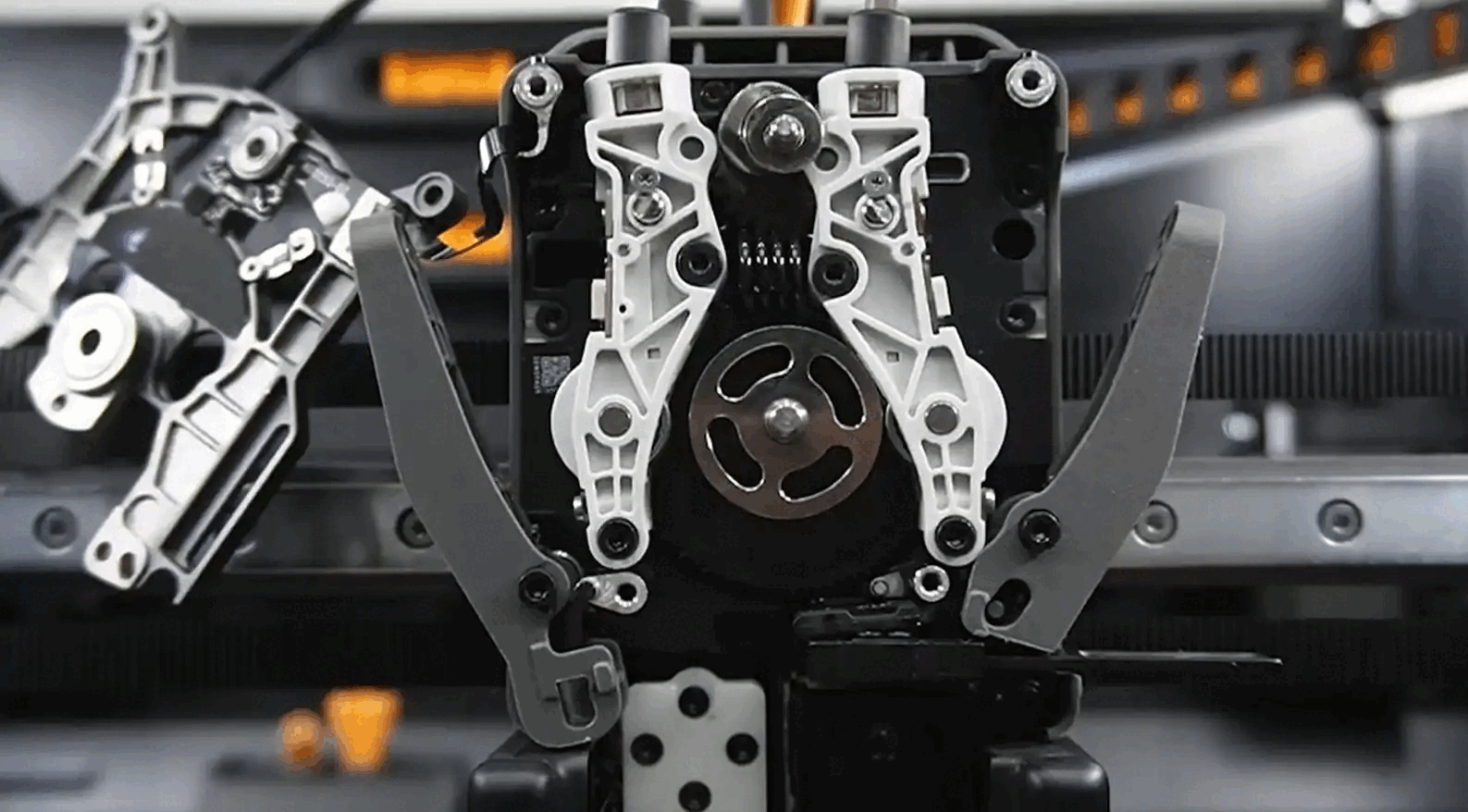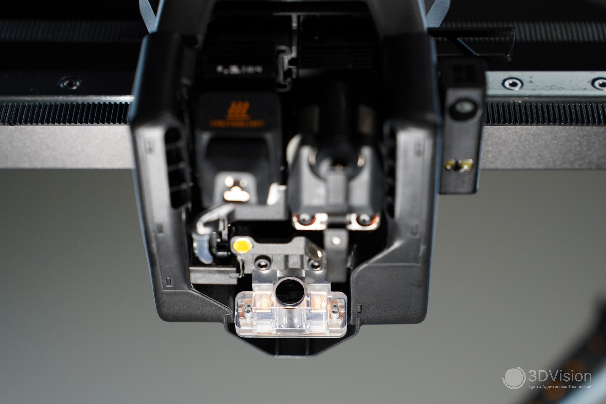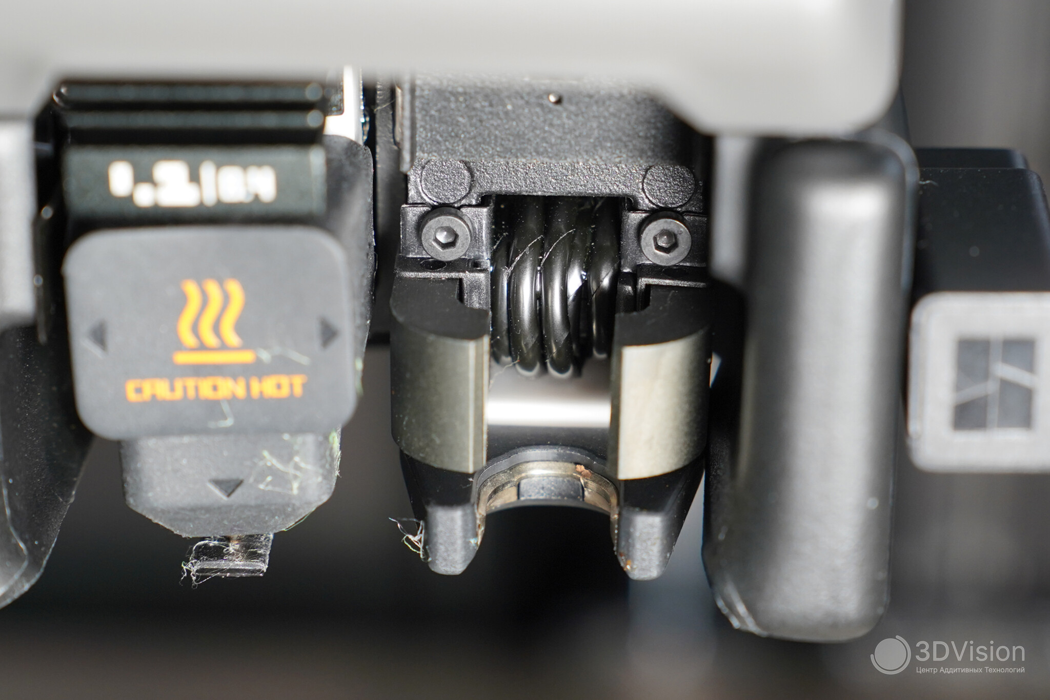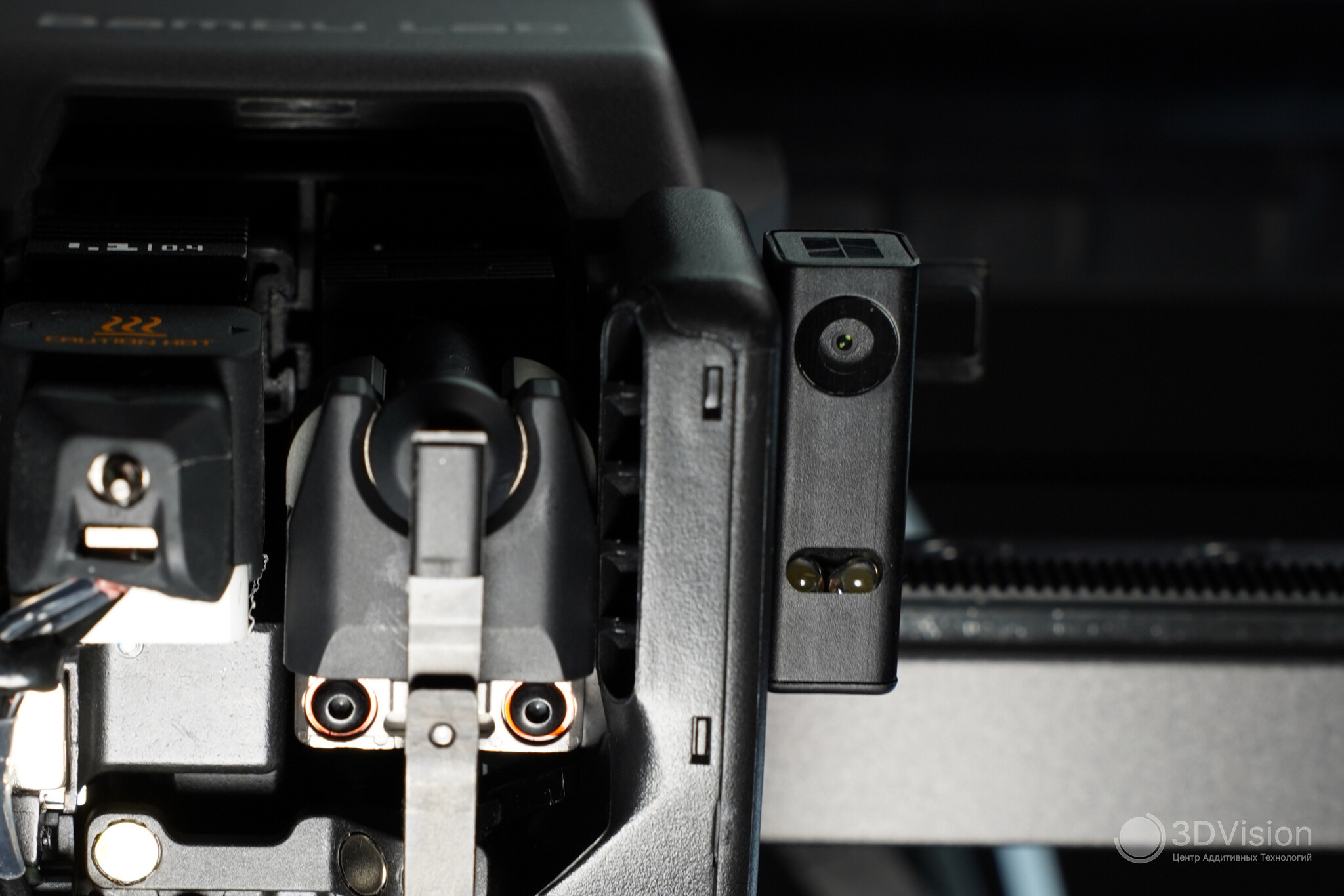 Ниже размещены шторки вентилятора камеры, за которыми находится сам вентилятор. Здесь же установлены натяжители ремней для осей XY. Чтобы отрегулировать натяжение, нужно ослабить винты и подвигать голову в разные стороны — ремни натянутся за счёт пружин.