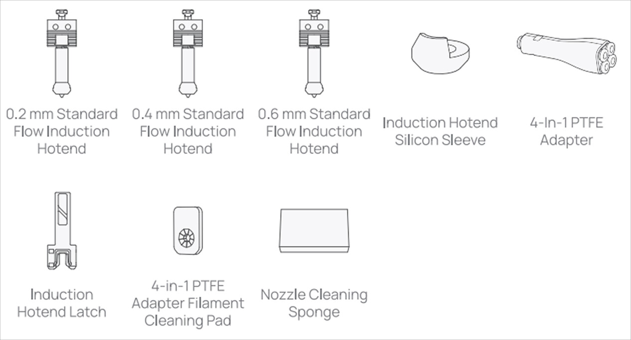 Индукционные хотенды: 0,2 мм — 1 шт, 0,4 мм — 4 шт, 0,6 мм — 1 шт.