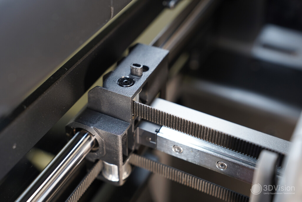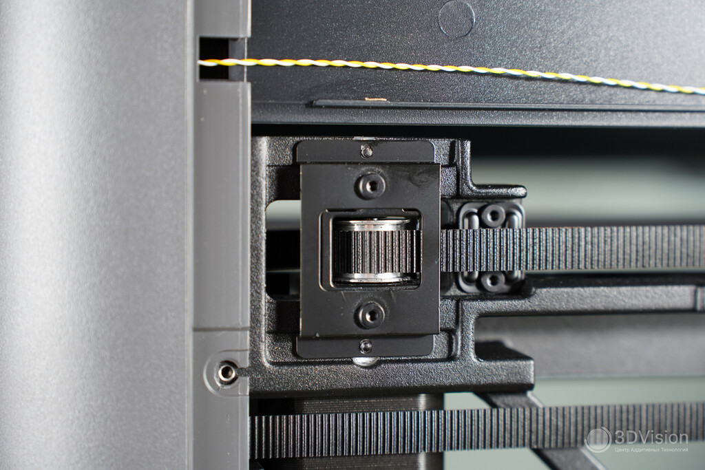 Снизу расположен ремень 2GT оси Z длиной 1444 мм и шириной 6 мм, который синхронизирует три трапецеидальных винта. Здесь же находится натяжитель этого ремня.