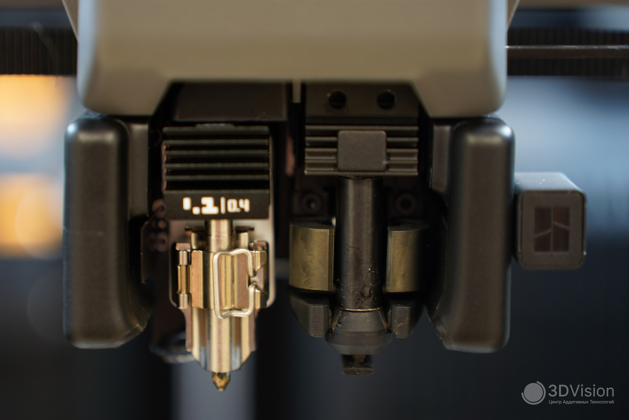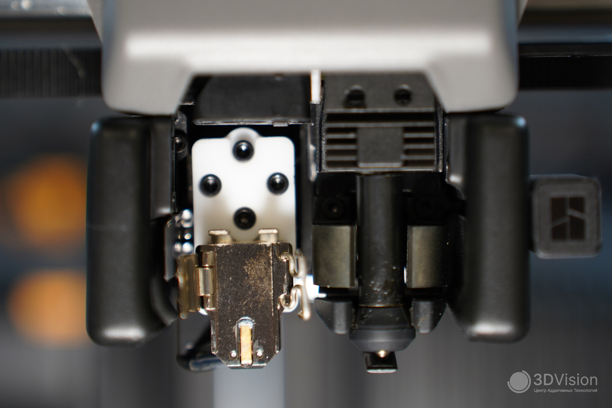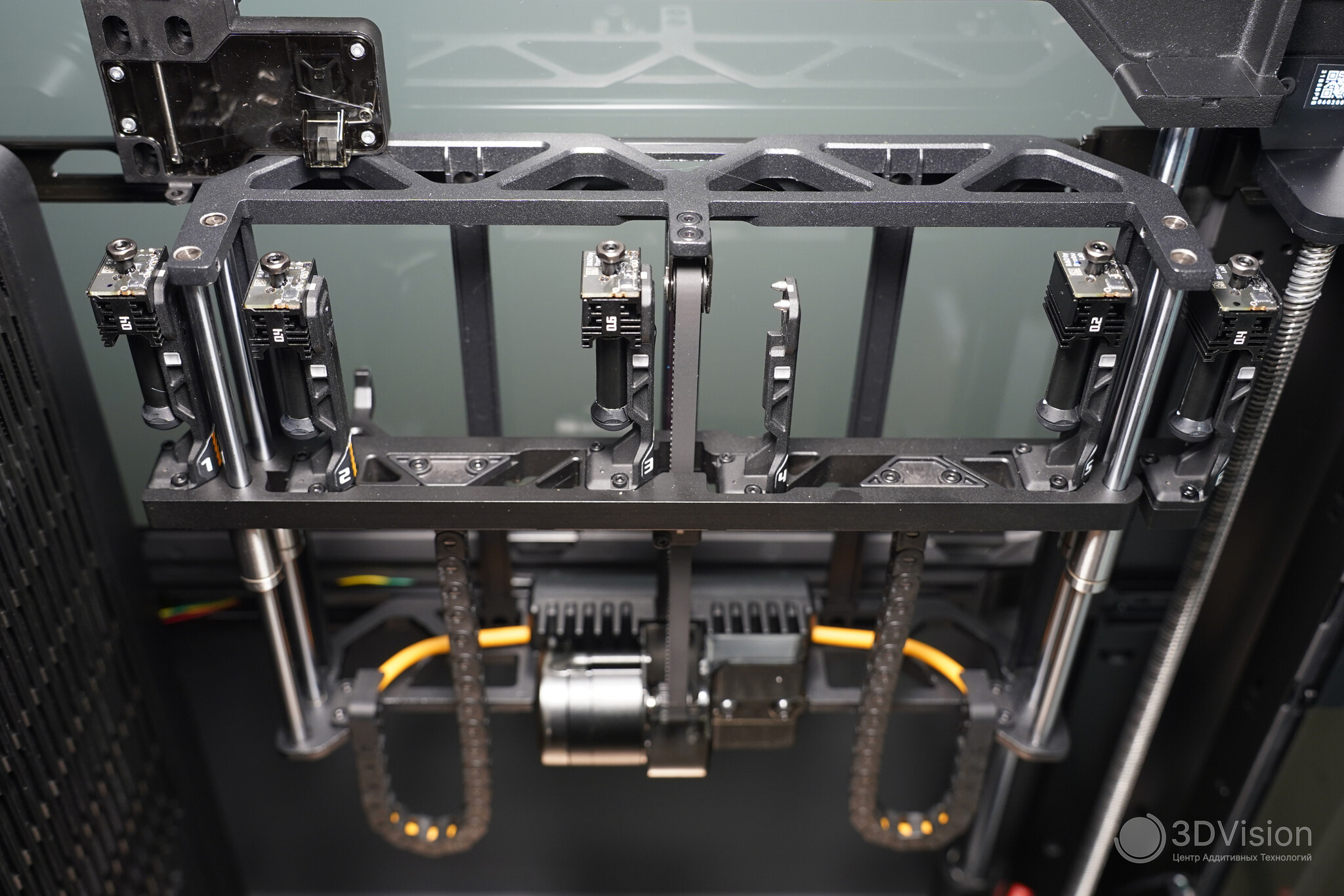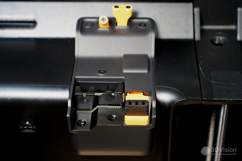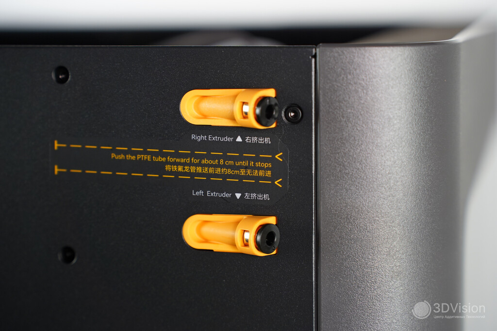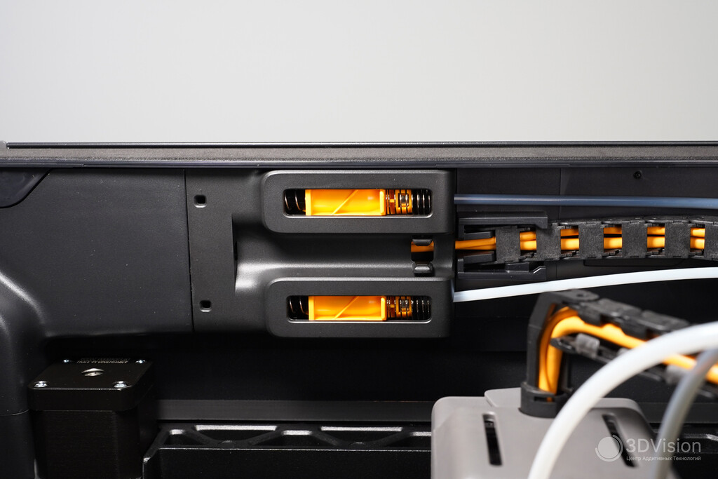 Начнём сверху вниз. Здесь расположены входы для филамента — для левого и правого хотендов и отдельный для эластомеров.