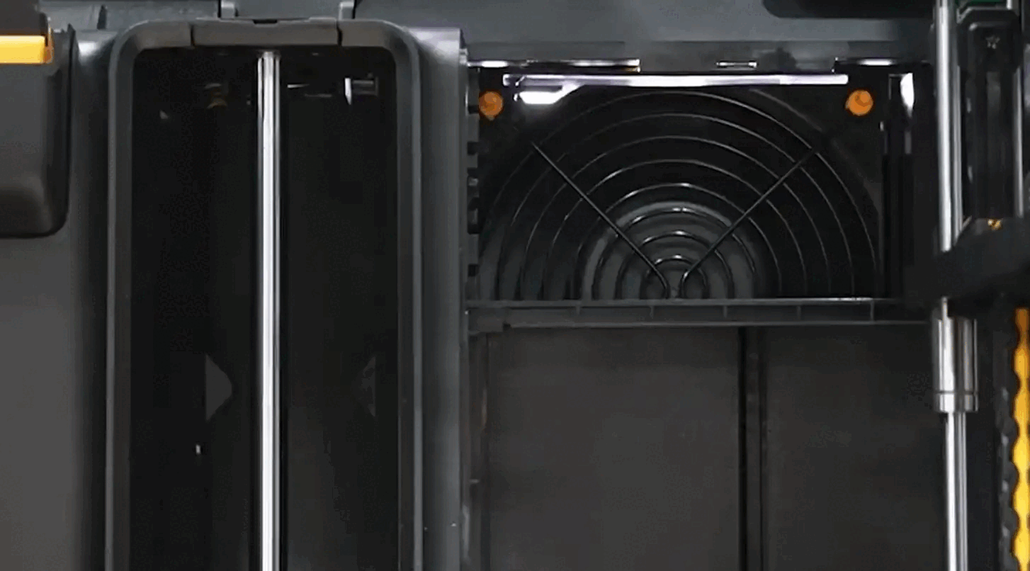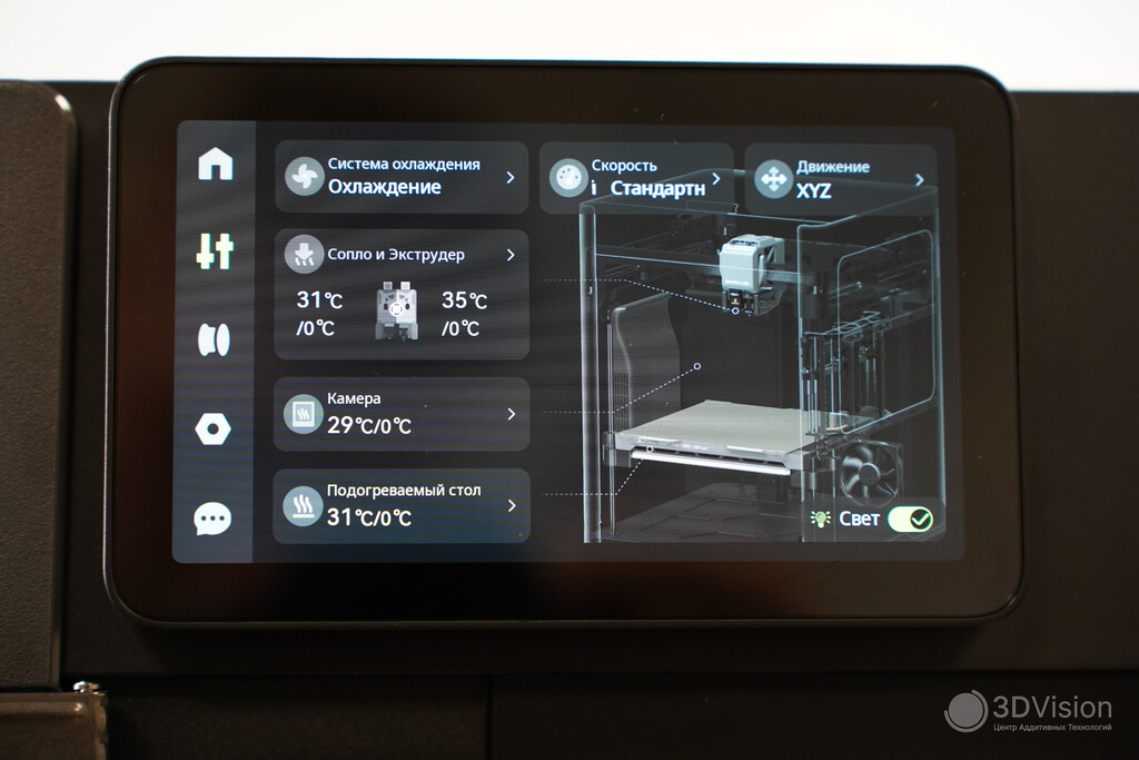 Как отмечалось, доступно два режима работы термокамеры — «нагрев» и «охлаждение». При включении «охлаждения» панель поднимается, в задней части принтера открываются шторки вентилятора, после чего включается вытяжной вентилятор.