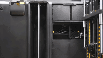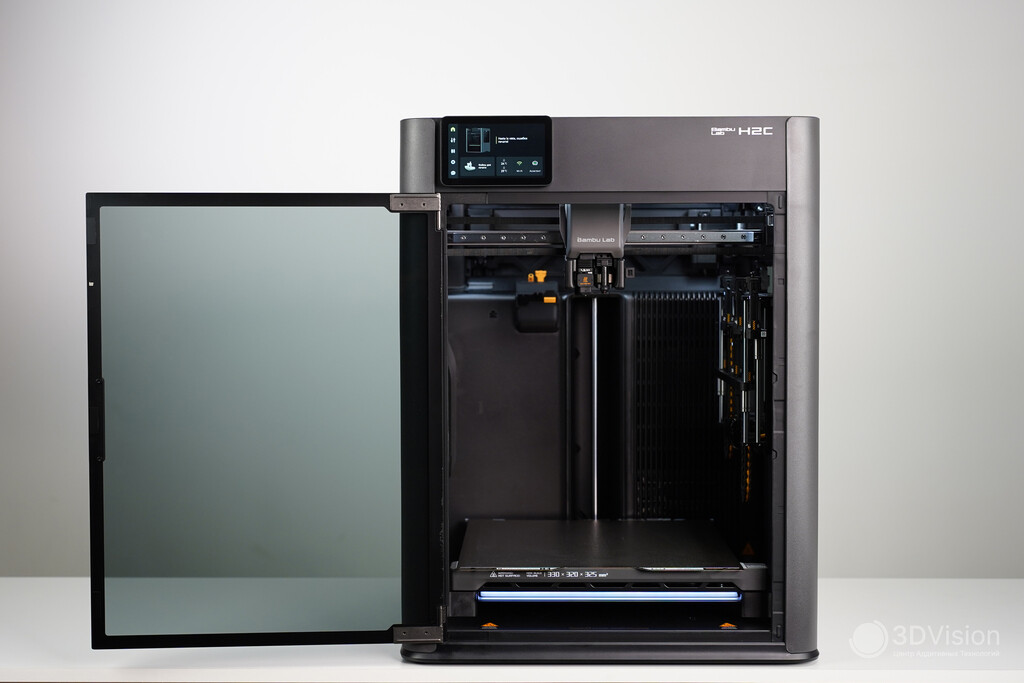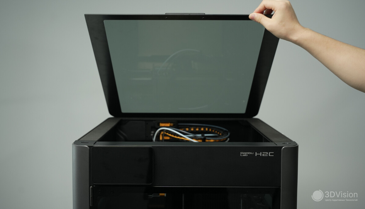 Дверь открывается на 180 градусов. И дверь, и крышка оснащены датчиками открытия. В зависимости от выбранных настроек при открытии двери H2C либо приостановит процесс печати, либо выдаст уведомление.