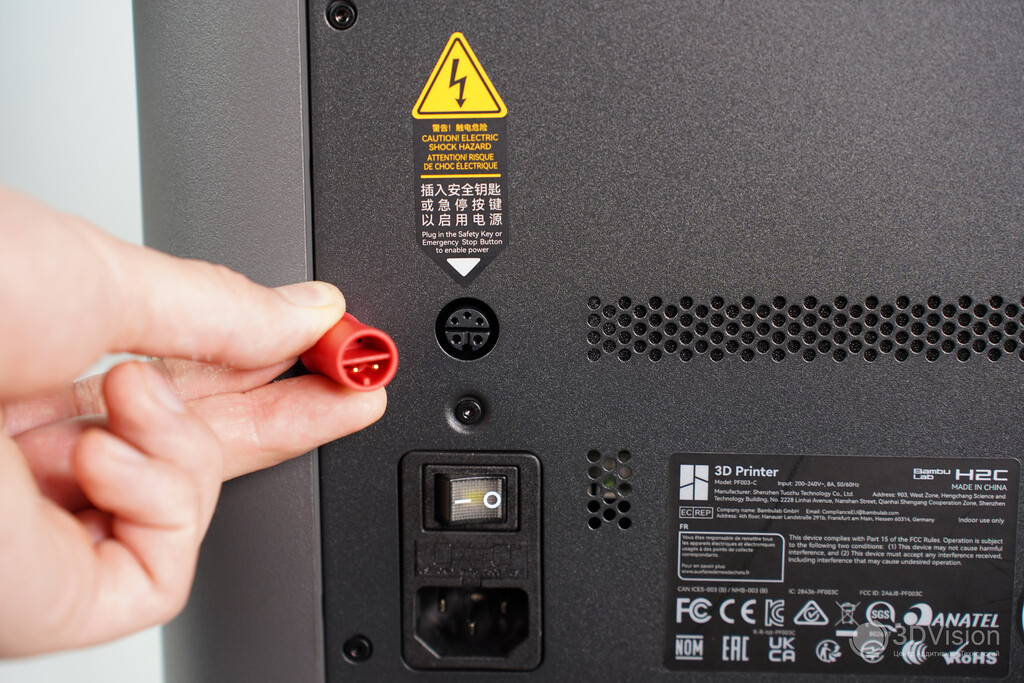 В нижней левой части корпуса находятся кнопка включения, разъём питания и защитный ключ. Принцип работы ключа аналогичен автомобильному — без него принтер не включится.