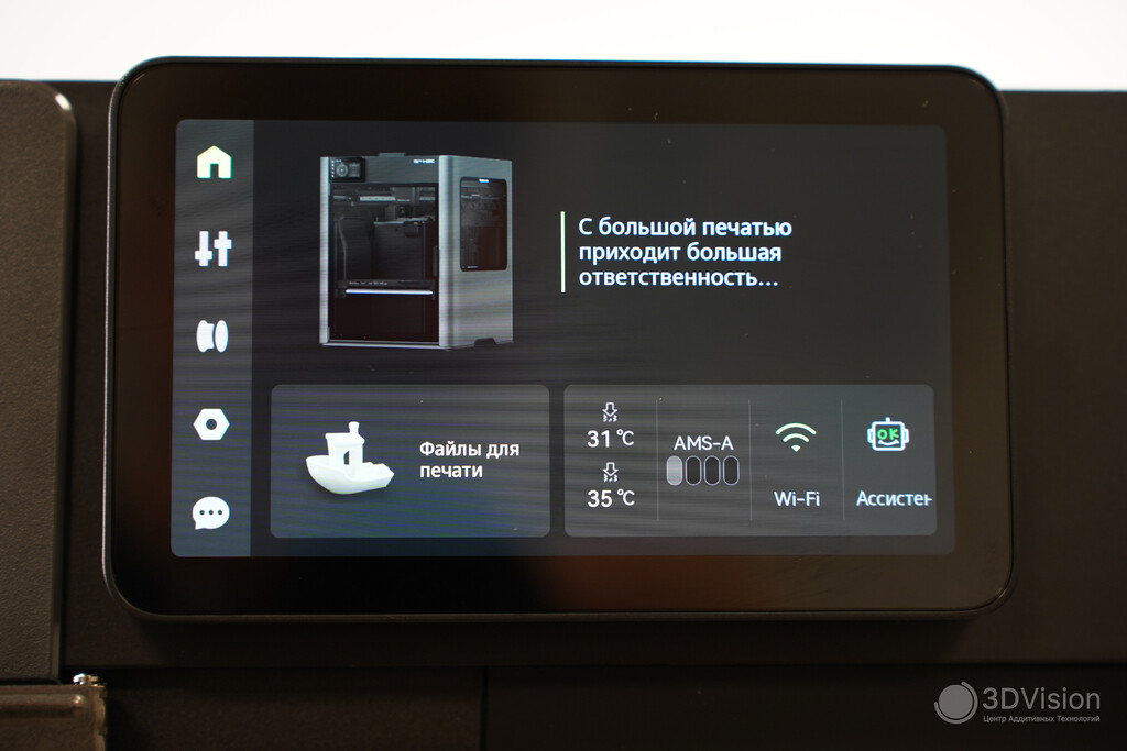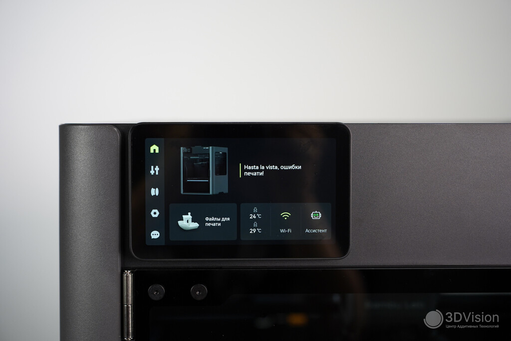 На стартовом экране доступен выбор файла для печати, температуры сопел и информации о филаментах в AMS, проверка подключения к Wi‑Fi и состояния ассистента. А ещё принтер выдаёт базу, и при каждом включении вы увидите одну из нескольких фраз типа «Hasta la vista, ошибки печати!».