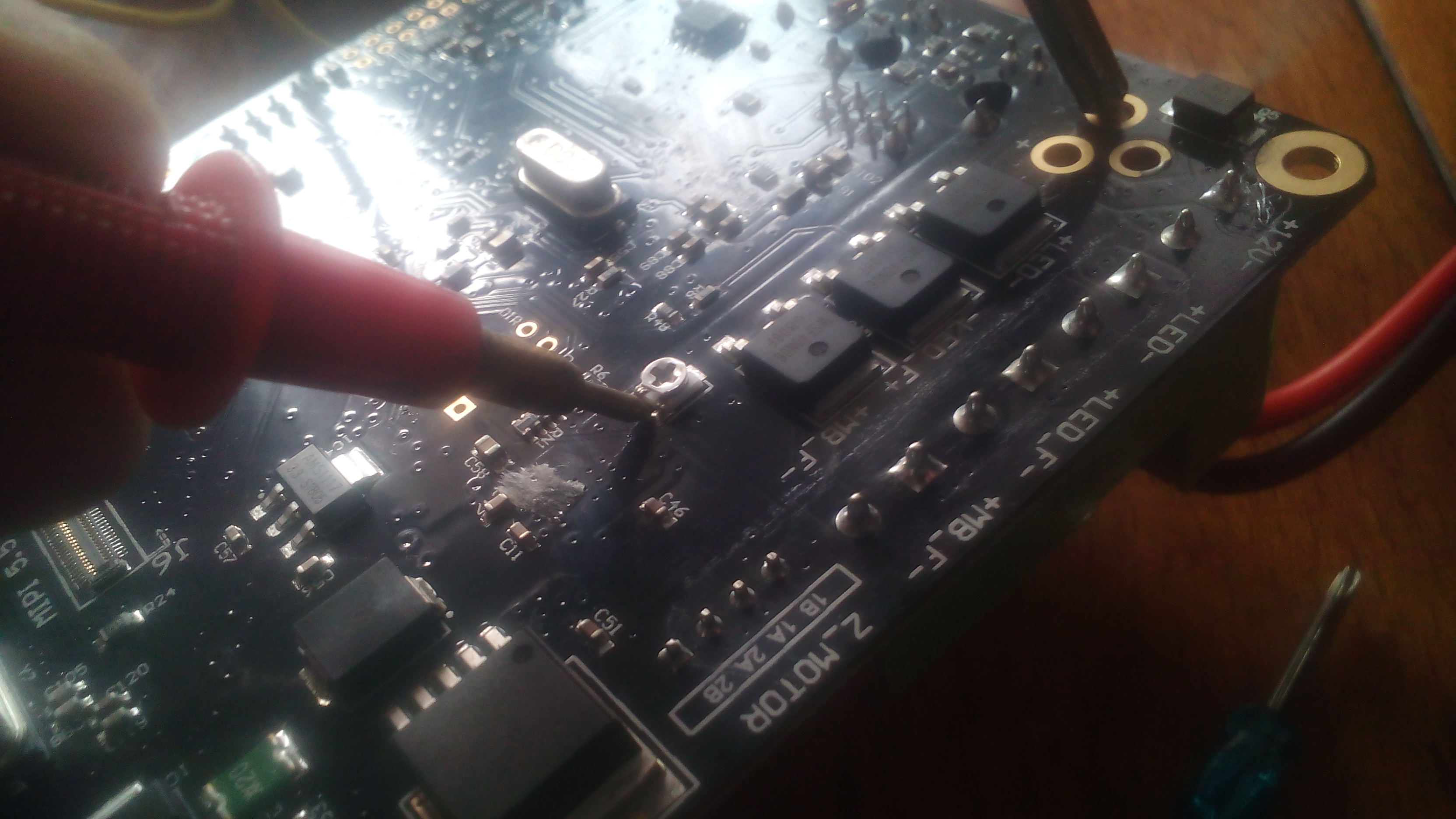 Измерение, регулировку производить при отключенном двигателе! К плате подключил только питание.Минус обозначен на плате, замер производим с правой (ближняя к разъёму Z_MOTOR) ножки подстроечного резистора. Результат замера Vref =0.913 подтянул до 1.195.