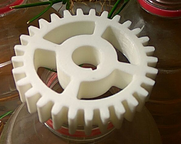 Комплектный пластик — 10м молочного PLA. Наилучшим образом скрывает все дефекты печати. Модель test.gcode на флешке — шестеренка на 2 часа печати с гаком. Качество отличное, не смотря на полное отсутствие обдува. А все потому, что печать очень медленная.