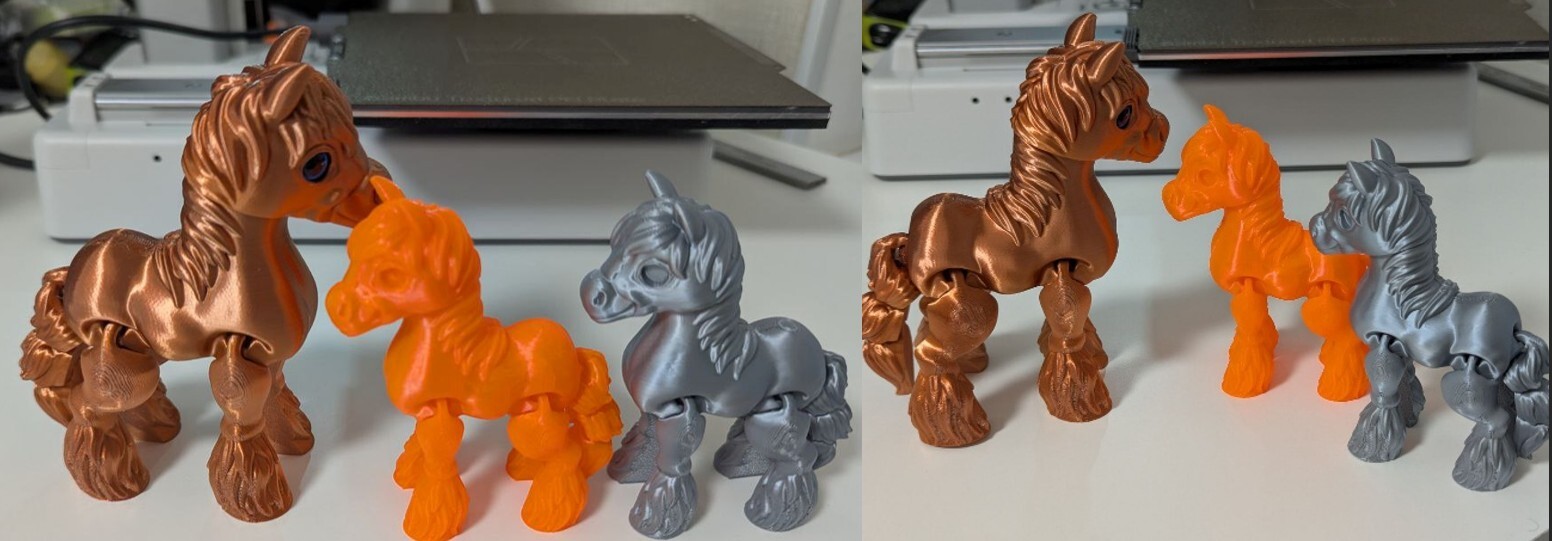 Для начала решил посмотреть на оранжево-морковный и серебряный ПЛА. Проверил диаметры прутков и запустил в печать лошадок, настройки оставил с предыдущей печати шелковым пластиком от ESUN. Качество печати получилось отличным, только вот оранжевый оказался немного прозрачным, но если добавить количество стенок, будет отлично. Серебряный меня порадовал цветом, конечно не блестит как серебро, но и не просто серый. Дефектов и пузырей не заметил, поток ровный. Остальные катушки будут ждать своего часа. Теперь буду ждать, когда появится возможность проверить их инженерные стекло- и угле-наполненные ТПУ, ING и PETG.