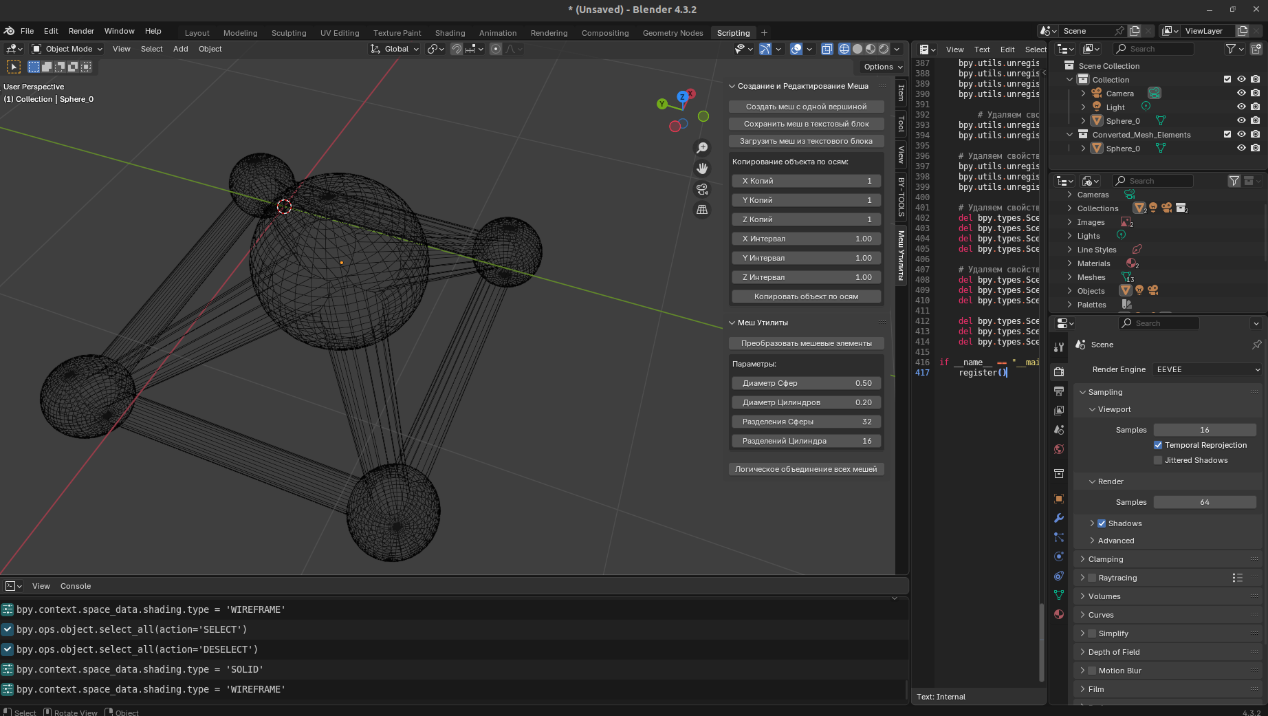 "Склеил", испытал и протестировал. Скрипт (оболочку аддона я просто не стал делать) позволит работать с ячеистыми структурами. Изначально планировал для фотополимерной печати, чтобы модели из каркасных структур составляющих весь объём детали. В набор входит операторов входит создание меша будущей ячейки структуры, сохранение в файл и чтение из файла. Некоторые этапы исключены, так как один из выполняются стандартным хоткеем в два действия, а второй более сложный - просто модификатором. Всего этапов работы 7 (без учёта сохранения и записи меша в текстовый блок). Сохранение и запись в текстовый блок сделаны больше наверное для возможности обмена, хотя может и так пригодиться. Затем делается копирование ячейки по задаваемым параметрам по трём осям, а объединение в один меш стандартным CTRL+J, удаление дубликатов вершин, модификация через Intersect структуры о внешнюю форму, затем грани удаляются скриптом, рёбра заменяются цилиндрами, вершины сферами (радиус и детализация задаётся как параметр), лишнее удаляется автоматически и так-же происходит пошаговое логическое объединение полученных объектов в один меш для конвертации в STL и последующей печати. Завтра при готовлю простенькую модель и напечатаю. На изображении меш полученный из копирования куба по трём осям (по копии на каждую) в пространстве до общего числа кубов - 4. Потом всё сделал как описал. Приходится ждать логических объединений некоторое время, на слабых машинах это может затянуться. Но вроде как использовать можно. За базовую ячейку для первой печати буду брать усечённых октадр с кубами. Правда и кубы и октаэдр прийдётся совместить в одну ячейку, но - кто не работает тот не ест.