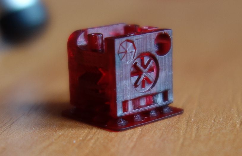 Ну и наконец-то - напечатанные детальки. Из-за того что материал полупрозрачный и блестящий, мой фотоаппарат наотрез отказывался фокусироваться на нём - я старался переубедить его, как мог, и надеюсь, что вам удастся разглядеть хоть что-нибудь. Материал - HARZ Model Cherry, слой 0.05 мм.
