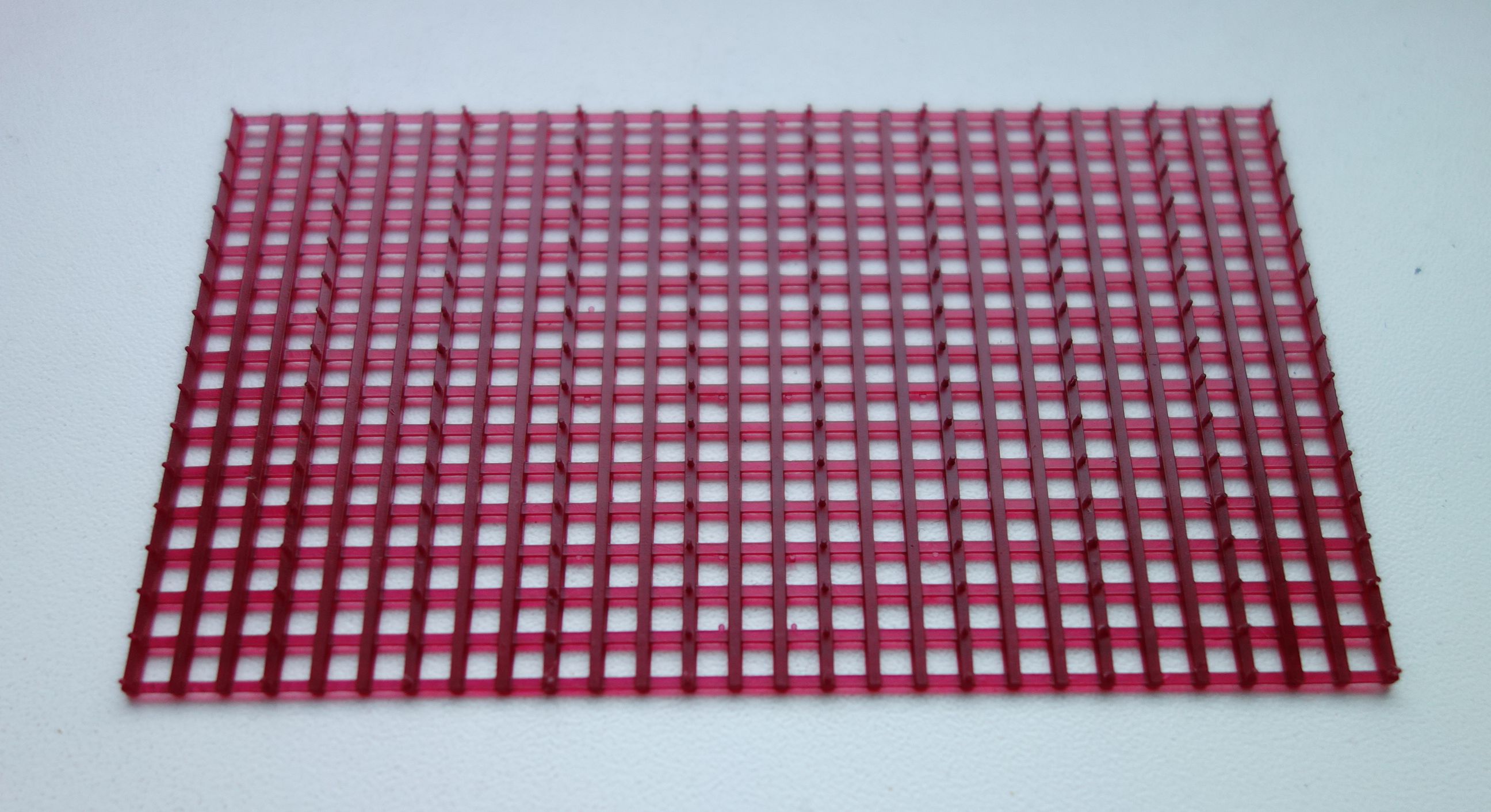 Три маленьких детали, напечатанные в разных местах экрана, от центра до края. Размеры и качество одинаковые. Тонкие вертикальные штырьки получились немного толще, чем на исходной модели - где-то на 0.05 мм, (точно измерить, опять-таки, не могу).