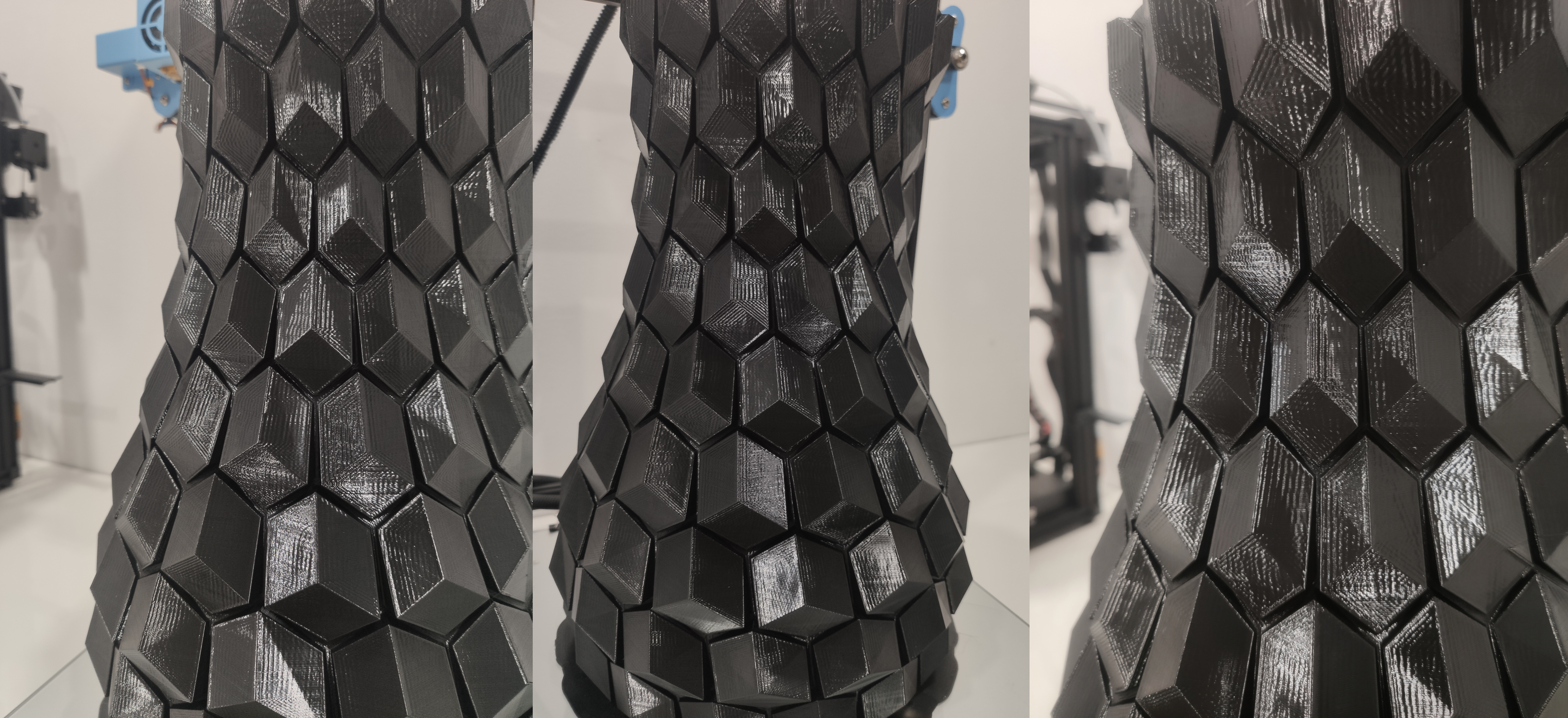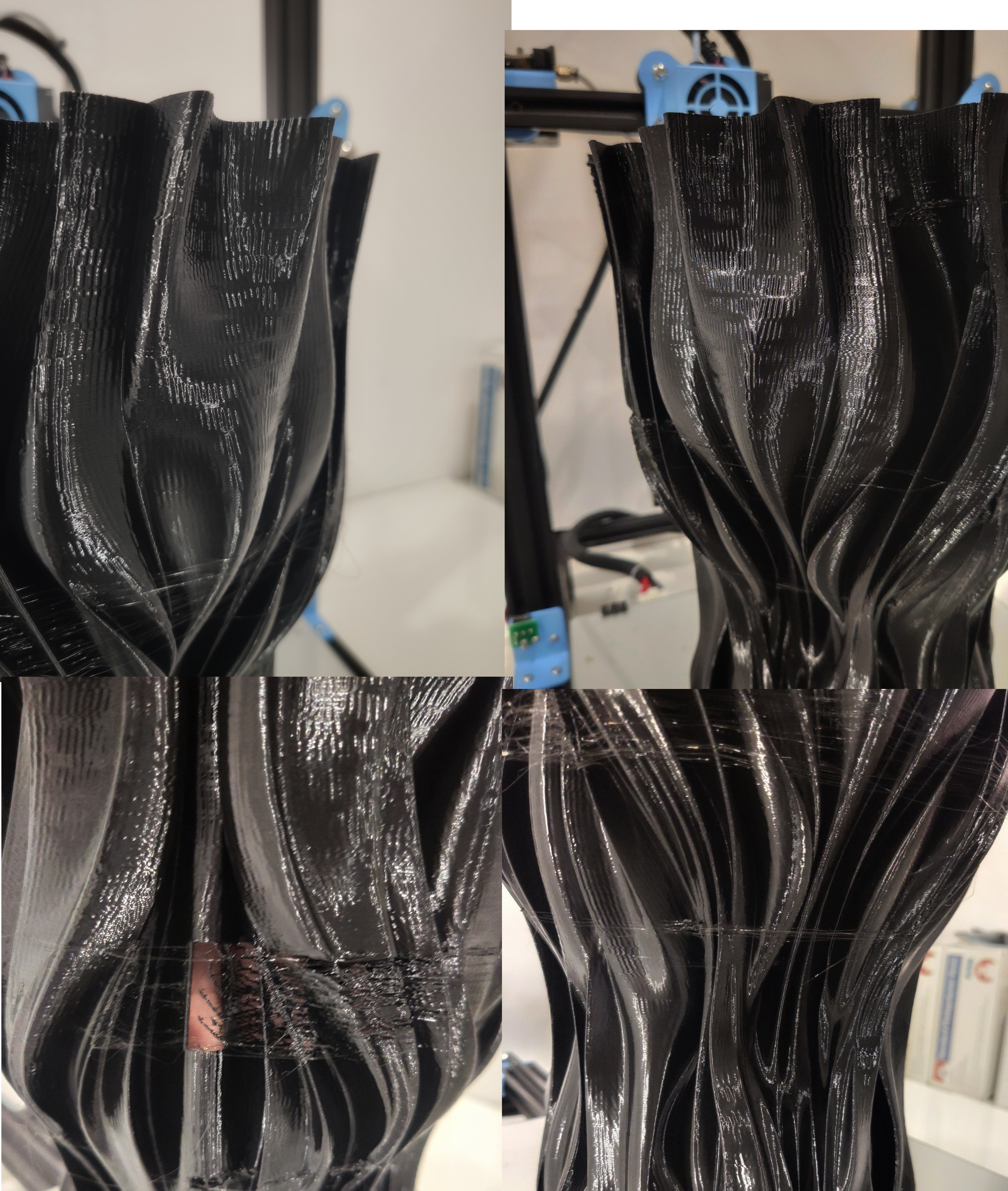 Во первых не знаю откуда взялись щели при печати спирально по контуру, откуда следы того что экструдер перемещался вокруг вазы. Перепроверял в слайсере - пришел к выводу что-то было в модели, никак не мог заставить не делать ретракты и кататься по спирали. Но тем не менее такие щели мне уже не понравились. Плюс в глаза бросился царь-воблинг. Не знаю как его еще назвать.