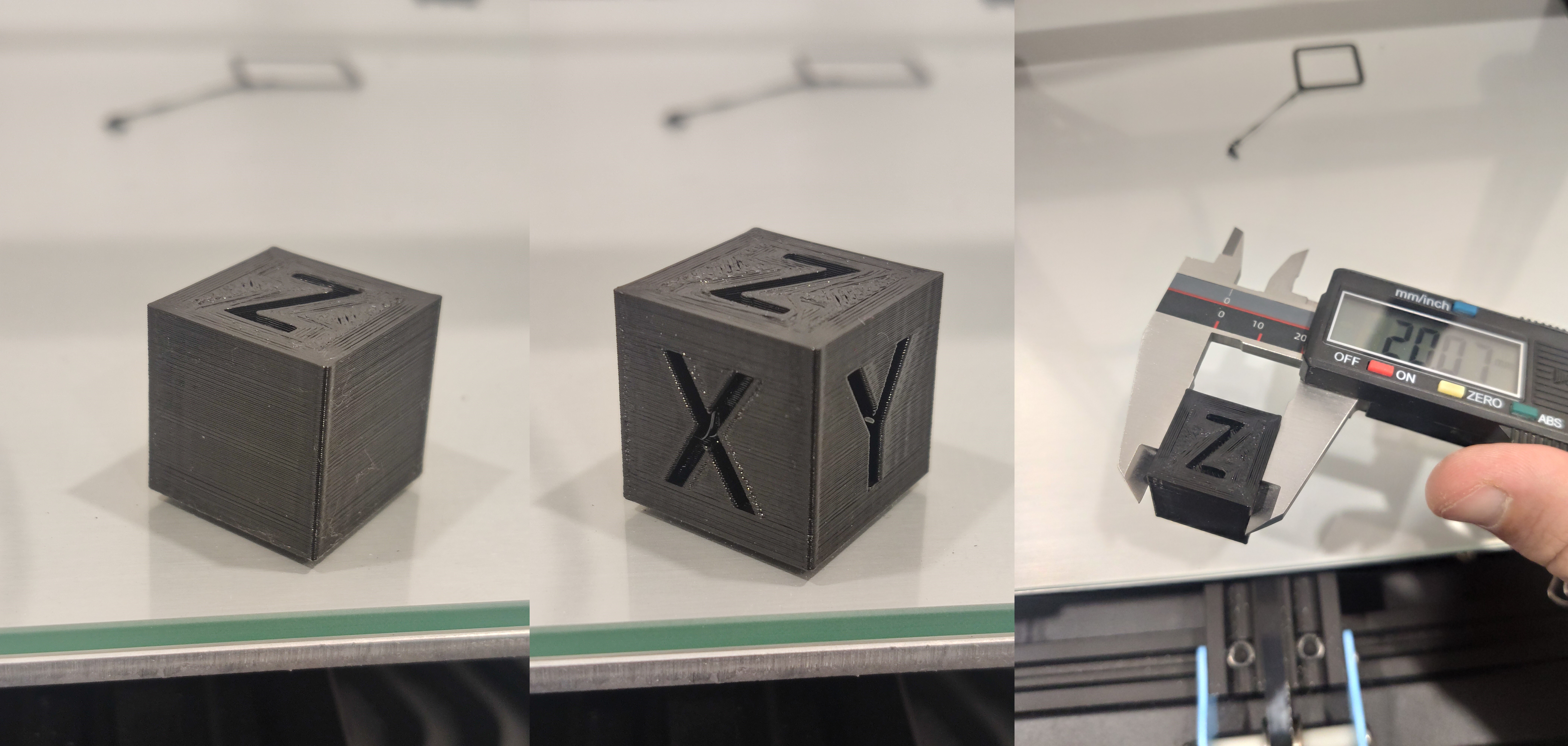 Как первая печать - неплохо. Видно небольшую недоэкструзию, добавлю 3-4% потока в Слайсере и все будет ок. Размер кубика получился отличный. Каких-то сильных артефактов не видно.