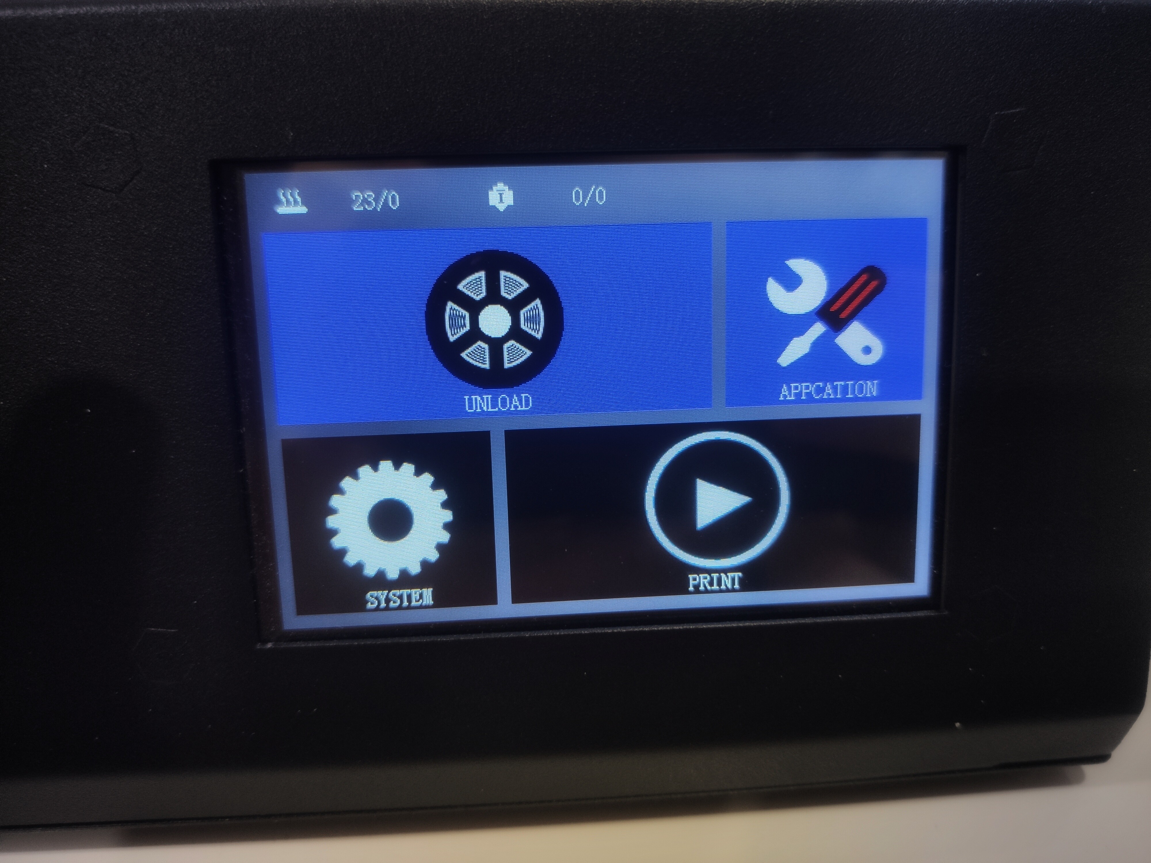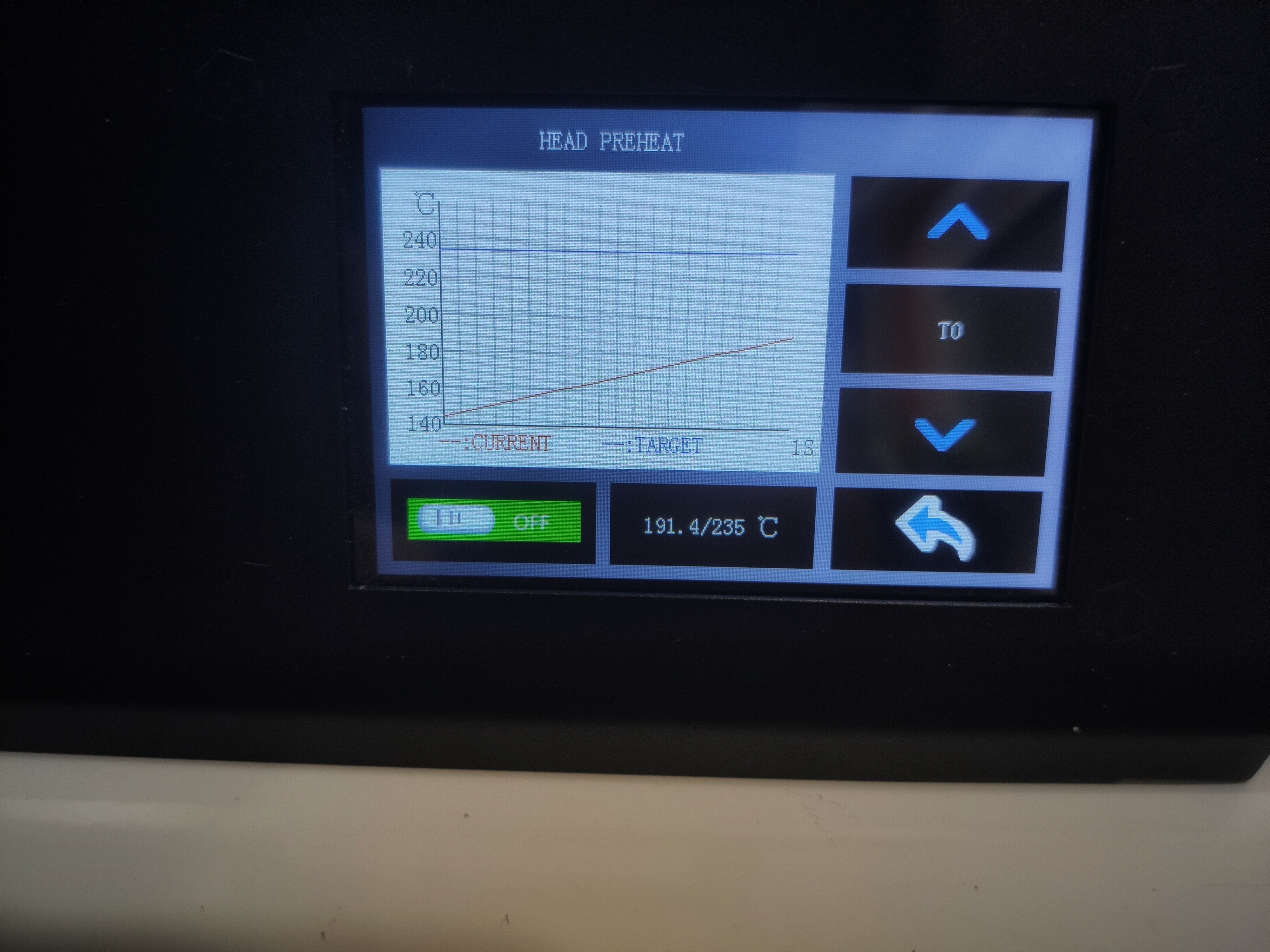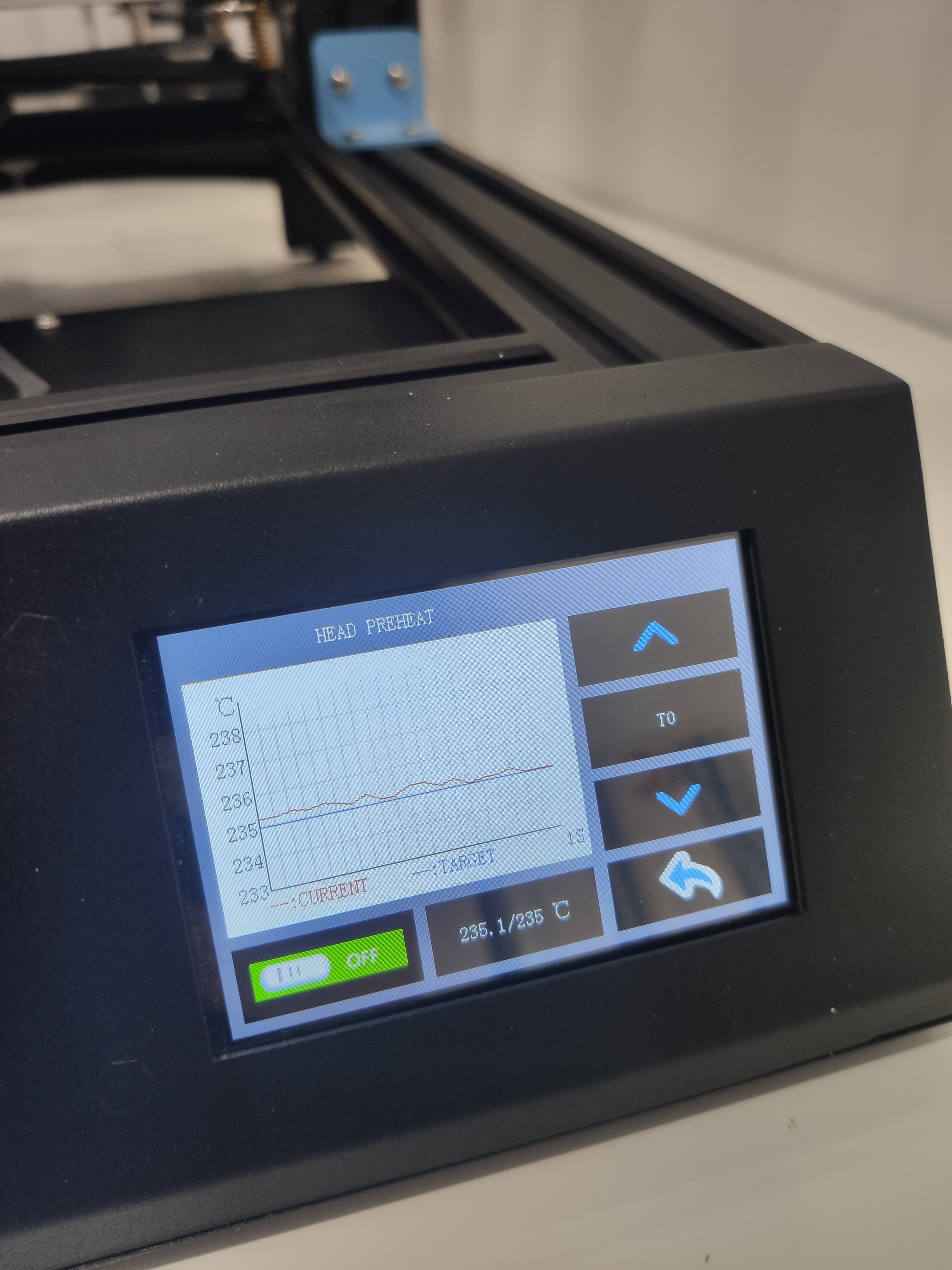 Но была ложка дегтя. Так как я привык к стандартному марлину и ему подобному, я сначала долго не мог понять как прогреть экструдер. Вроде указал температуру, вроде нажал то вкл, то выкл, ничего не происходит. И только потом я понял то, что меня смутило на главном экране.