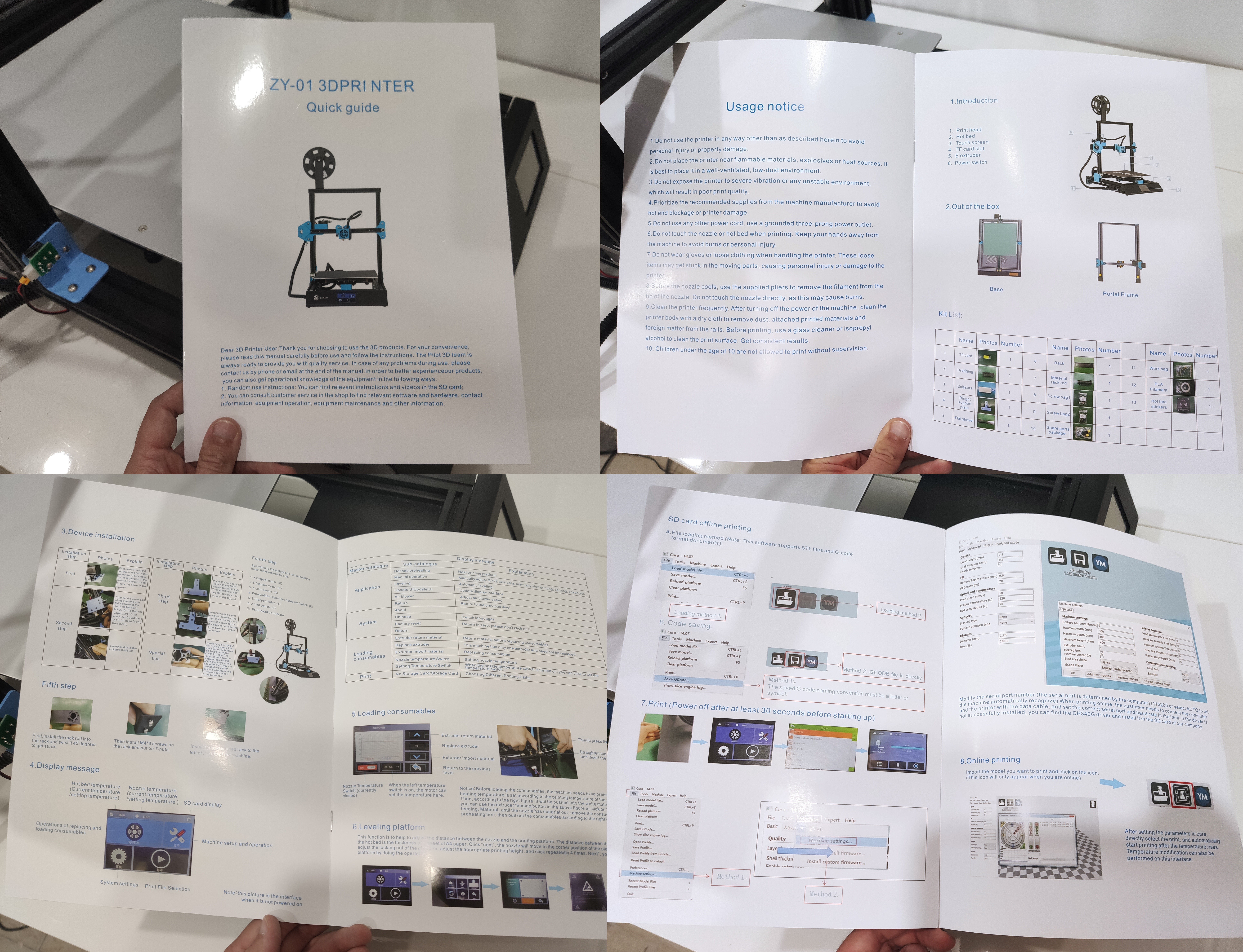 Под первым "слоем" нас встречает инструкция, клеящийся стикер на стол, стекло, и основание принтера полностью предсобранное.