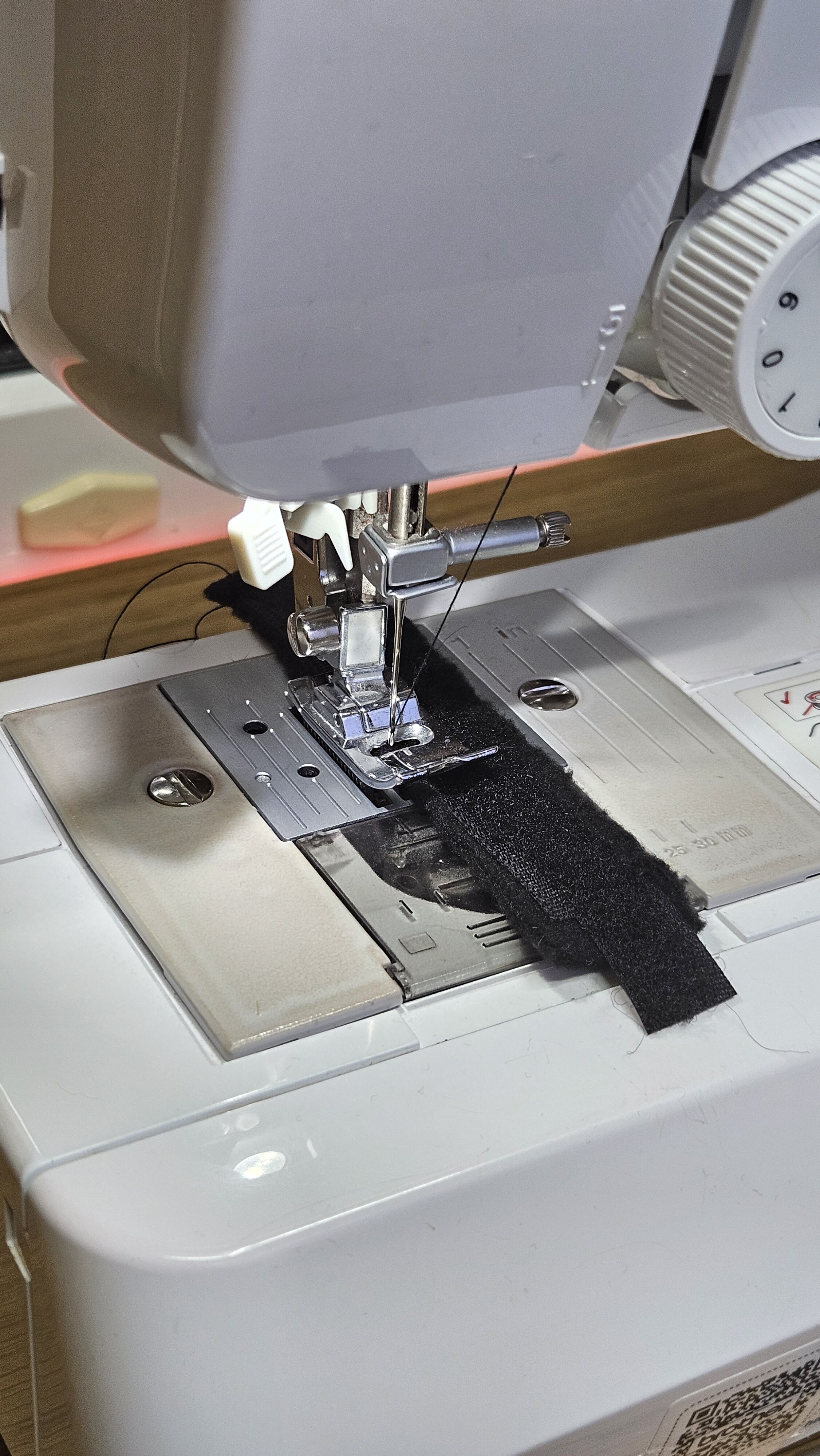 Пришлось временно экспроприировать собственность супруги - швейную машинку, чтобы сшить ремешки с липучками. Шью я так-себе, криво косо, потому что торопился. Ну и внутреннее "и так сойдет" тоже давало о себе знать. Самм непростым было - нажимать на педаль левой ногой.